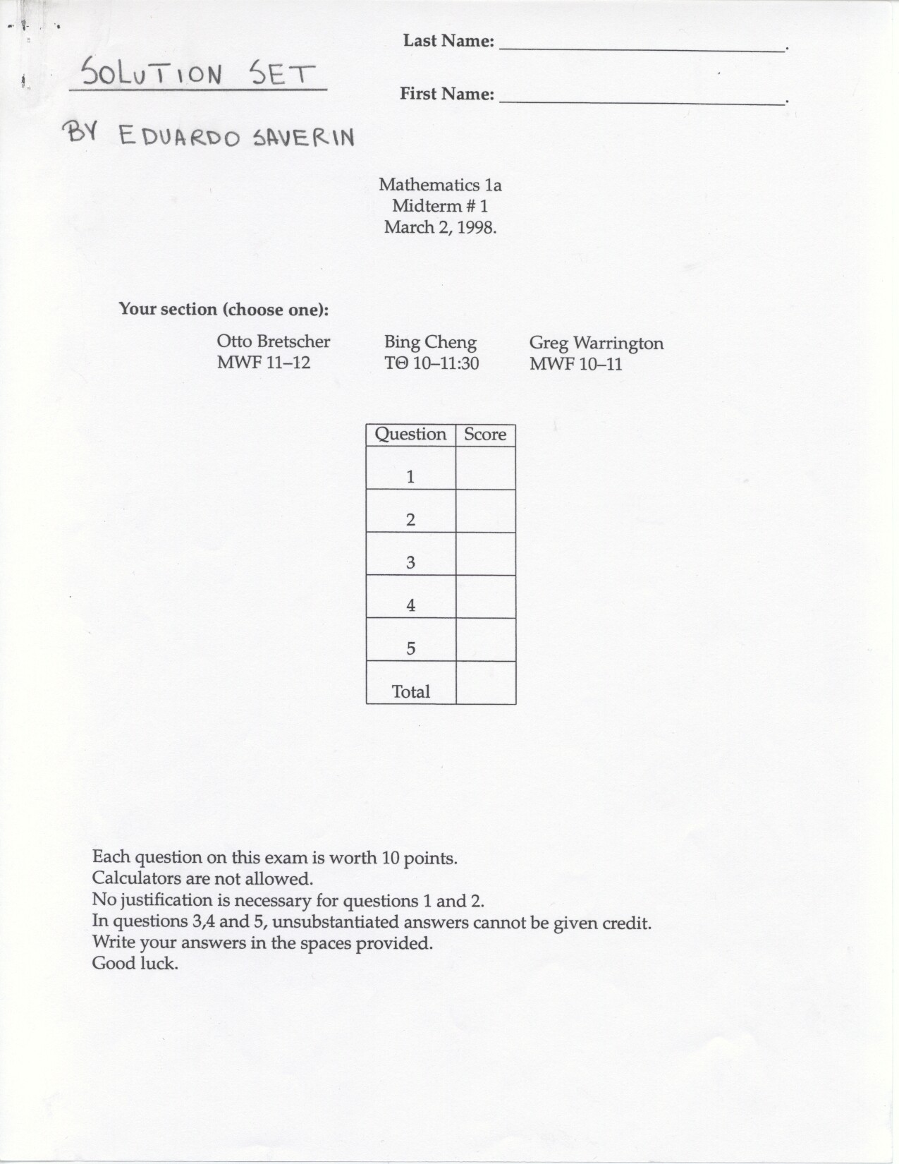 Mathematics 1aIntroduction to CalculusCourse Head: Robin Gottlieb Head CA: Andrei Boros