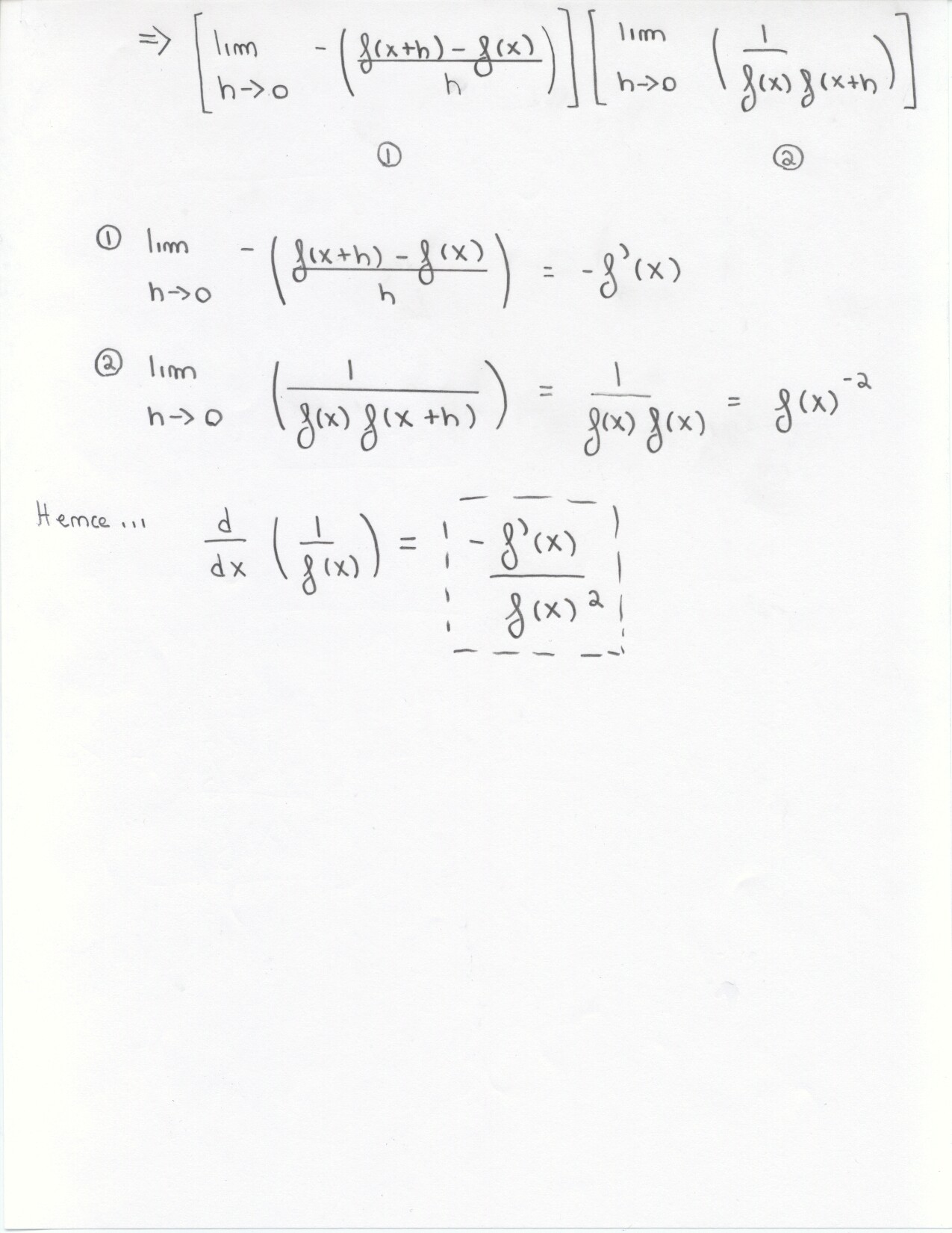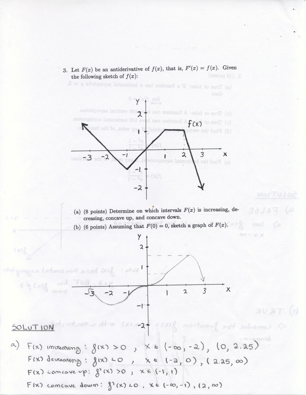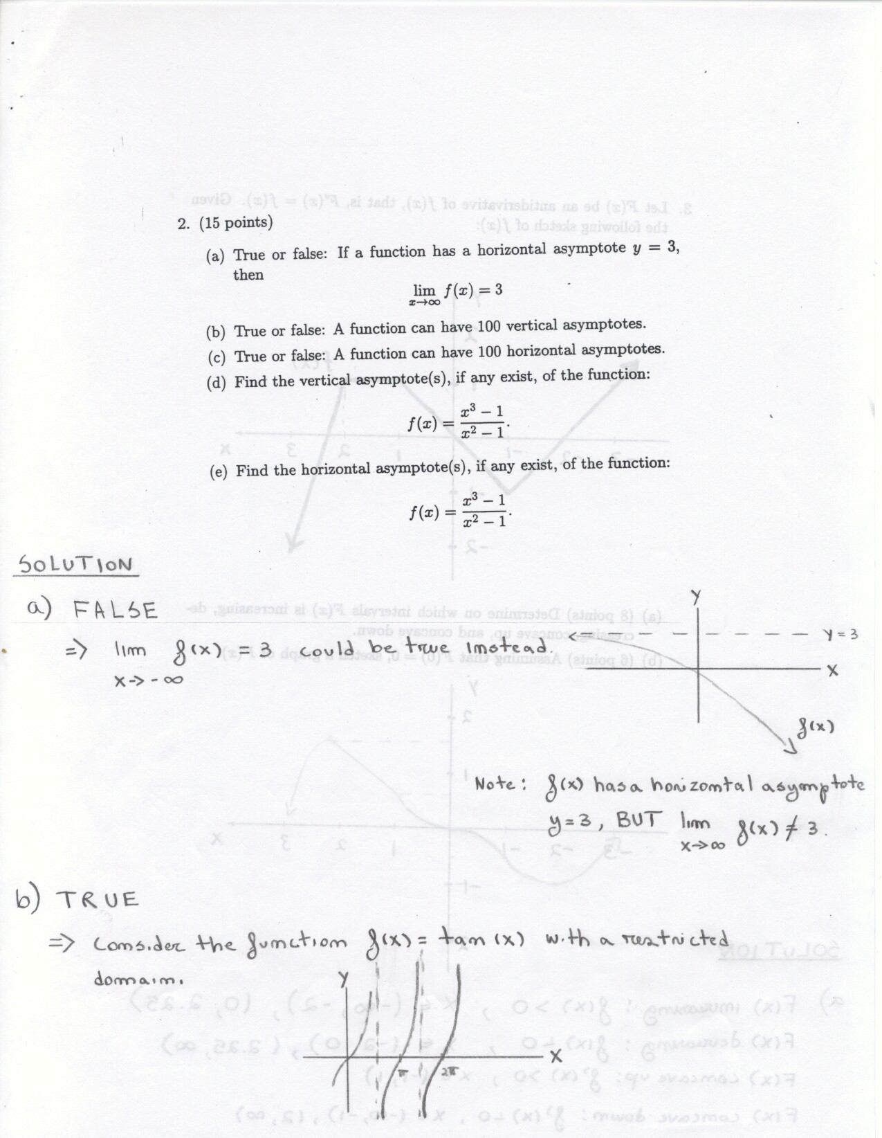 The following problems can be omitted (since we didn't emphasize the material this year) Review problems # 8bc and 37 Jan. 19, 2000 exam (Winters) # 12ce Jan. 23, 2000 exam (Siu): long and challenging . . . May 23, 2000 exam: #6. Note: Solutions for the May 2000 exam have been fixed and are back up. Additional corrections to Fall 2002: #1(a) lim x to 2 should be written two more times. #1(c) Unlike the damped oscillations in part (d), these are getting wilder as x increases. #2: if the explanation given in the corrections is not adequate, please see Ex 6 p. 137 in your text. #3c arctan x would have two horizontal asymptotes. #4. When you give a linearization, make sure that what you have is the equation of a line! L (x) = f(a) + f'(a) (x-a) or in this case L(x) = f(25) + f'(25) (x-25). It is not necessary to use this "formula" in order to get the linear approximation. The correct answer is 5.1 as stated in the corrections. #6: I would say that the velocity graph does NOT have a vertical asymptote at x=3, but rather a jump discontinuity. Corrections to spring 1998: # 1(d) False: let f(x) = 1/x and g(x) = 5/x. The limit rule quoted is only true if both limits independently exist. 1(e) The statement is false but the reason given doesn't make sense. If the function is continuous from the left and right with the definitions stated then the function must be continous. However, the left and right hand limits could be different, or we could have the left and right hand limits equal but the function defined at c to be something entirely different. #5: f'(2) is not 1. This says that as h approaches 0 the difference between f at 2+h and at 2 approaches -1. Try f(x) = 4 for x <2 and f(x) = 3 for x>2 for example.