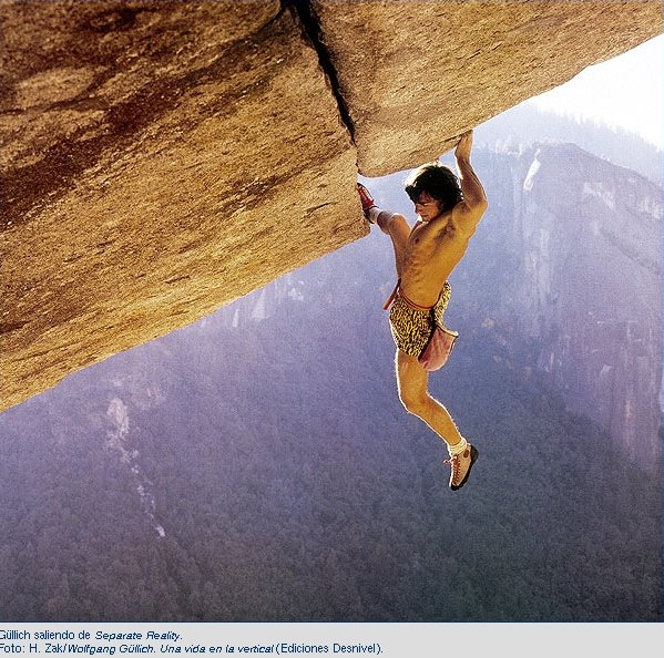 Separate Reality 7b, is a climbin route in Yosemite. You see Martial Dumas filmed by Didier Chenevoy. Wolfgang Güllich was the first to climb this route without ropes.
