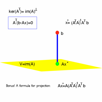 (The least square solution formula was obtained from AT (b-A a) = 0 which paraphrases that the "error" (b-A a) is perpendicular to the image of A. Geometrically this means that A a is the projection of b onto the image of A. )