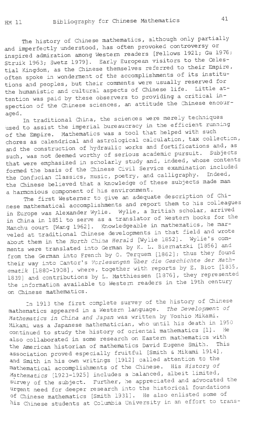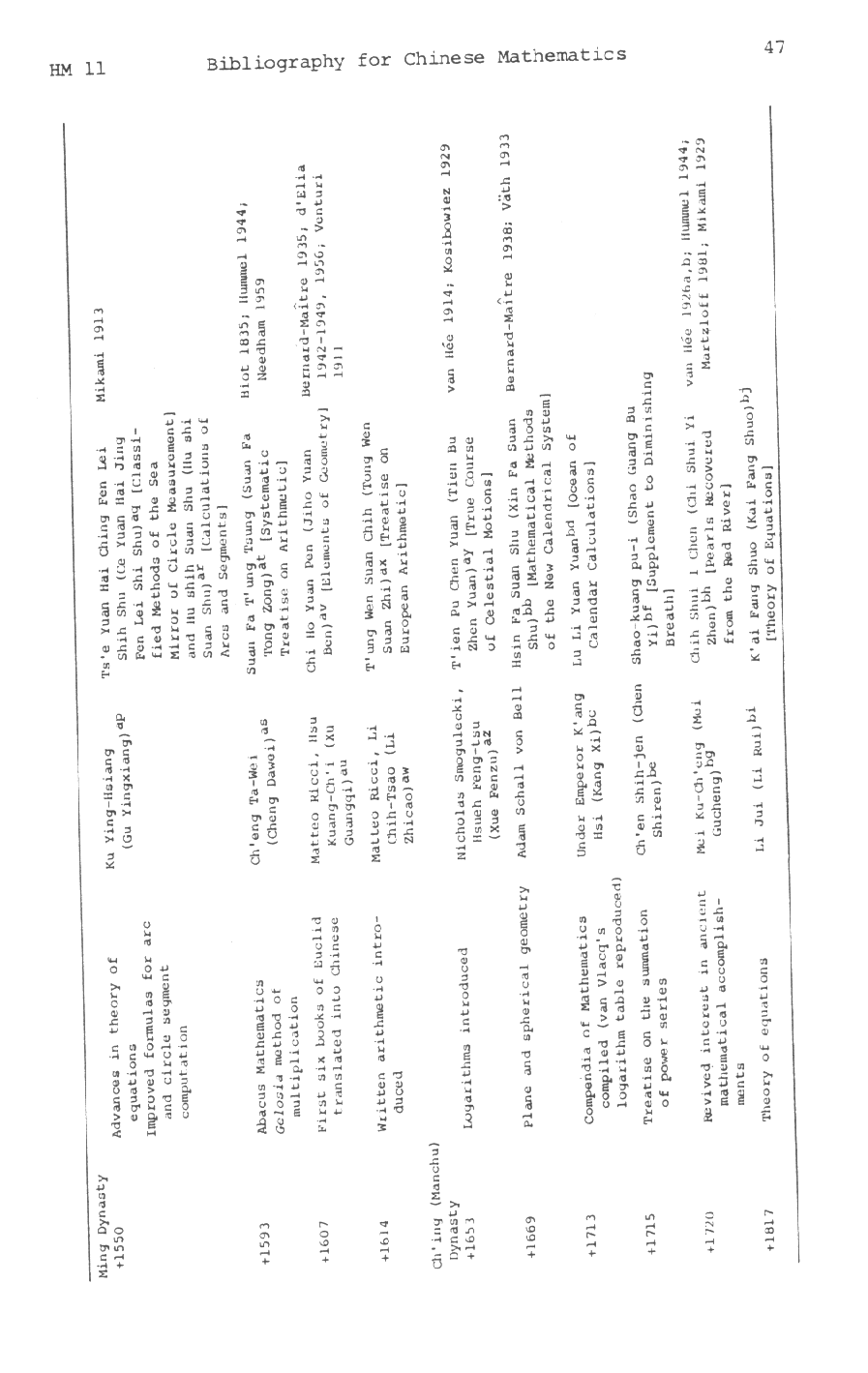 Copy of the article "A Brief Chronological and Bibliographic Guide to the History of Chinese Mathematics", by Frank J. Swetz, (Penn State University), and Ang Tian Se (University of Malaysia), in Historia Mathematica 11 (1984), page 39-56.