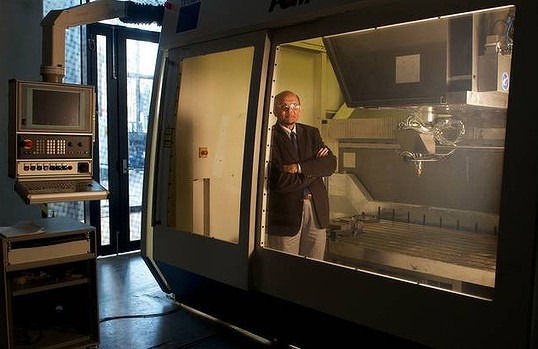 The printer is the size of a bedroom and dispenses metal instead of ink. Researchers at Swinburne University believe this 3D printing machine could help to save Australia's manufacturing industry. It prints metal objects in layers based on computer-designed plans. It can produce complex metal shapes in steel, chromium or cobalt that can be used in engineering materials. In the latest breakthrough Professor Syed Masood has developed a technique to dramatically speed up the process for manufacturing metal parts. The Age News Picture by Wayne Taylor 13th August 2012 Dr Syed Masood with a 3D printing machine at Swinburne Uni Hawthorn, which could help save manufacturing. An example of what the machine can do. Professor Masood has experimented with the composition of metal tools that manufacturers use to produce objects such as car components. He has used the Direct Metal Deposition machine to combine copper and steel in new quantities and layers, allowing molten metal tools to cool down much faster than was previously possible. This slashes lengthy waiting periods from the process of producing metal parts.