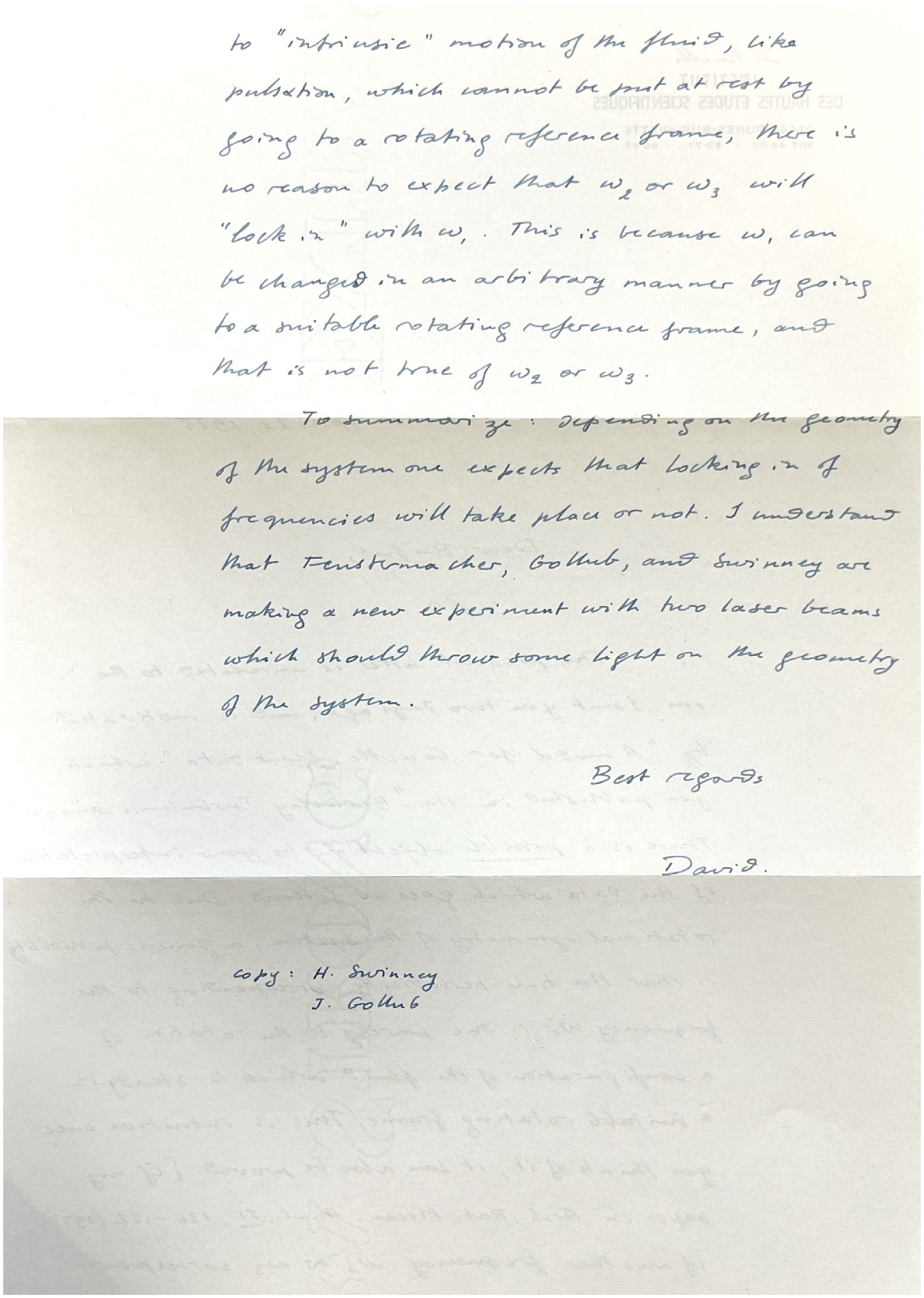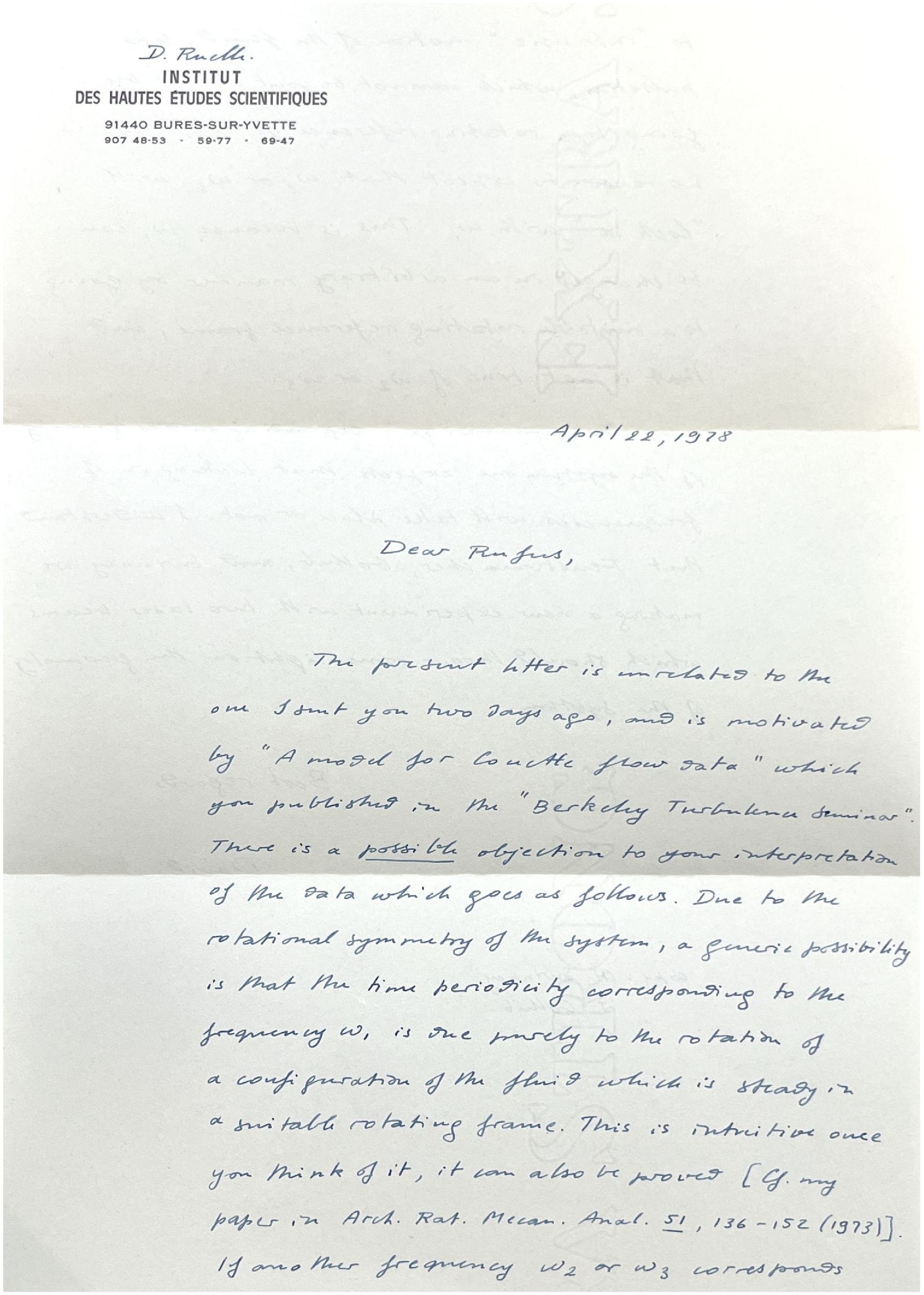 April 22, 1978 Dear Rufus, The present letter is unrelated to the one I sent you two days ago, and is motivated by "A model for Couette flow data: which you published in the "Berkeley Turbulence Seminar." There is a possible objection to your interpretation of the data which goes as follows. Due to the rotational symmetry of the system, a generic possibility is that the time periodicity corresponding to the frequency; is one purely to the rotation of a configuration of the fluid which is steady in a suitable rotating frame. This is intuitive once you think of it, it can also be proved [Cf. my paper in Arch. Rat. Mech. Anal. 51, 136-152 (1973)]. If another frequency w1 or w2 corresponds to "intrinsic" motion of the fluid, like pulsation, which cannot be ruled out even by going to a rotating reference frame, there is no reason to expect that w2 or w3 will "lock in" with w1. This is because w1 can be changed in an arbitrary manner by going to a suitable rotating reference frame, and that is not true of w1 or w2 To summarize: Depending on the geometry of the system, one expects that locking-in of frequencies will take place or not. I understand that Fenstermacher, Golub, and Swinney are making a new experiment with two laser beams which should throw some light on the geometry of the system. Best regards, David. Copy: H. Swinney J. Golub Let me know if you need further assistance or clarification with this letter. |