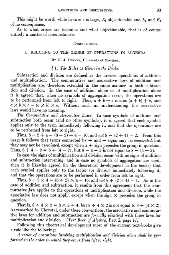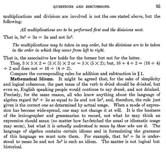 in 1928-29, "If an arithmetical or algebraical term contains / and x, there is at present no agreement as to which