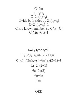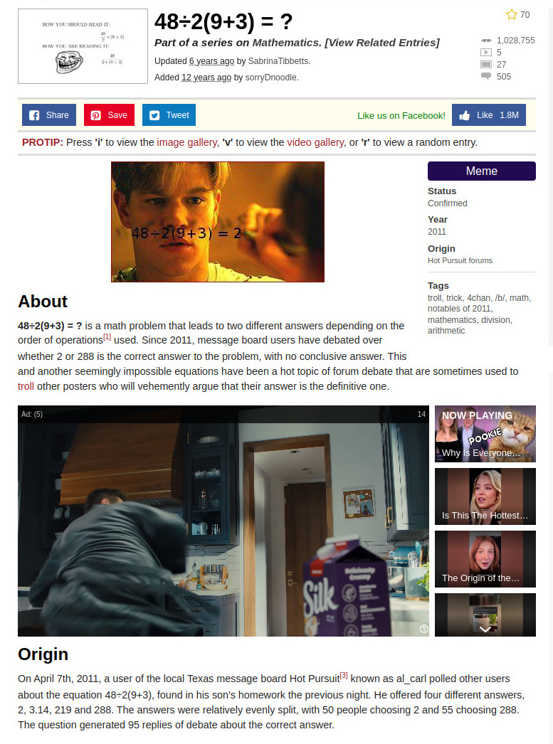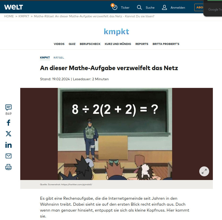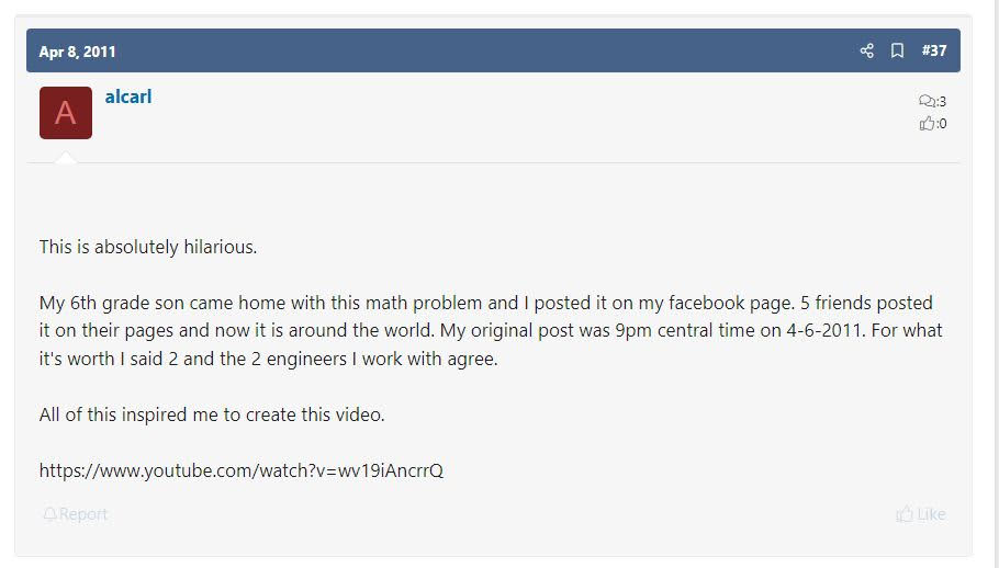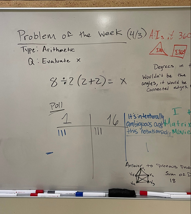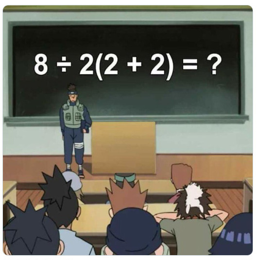 April 16, 2025: Louis writes Four years ago, I wrote to you about a problem on the internet 6/2(1+2). We discussed the inherent ambiguities of the problem; logical mathematical properties and you ultimately convinced me that parentheses were the only logical resolution to the problem. Since then, I have followed your AMBIGUOUS PEMDAS blog over the years and in my mathematical bumbling, I have recently stumbled upon a mathematical proof which I believe demonstrates unequivocally the actual answer to the problem without the need for parentheses. I realize that, in the current environment, parentheses is the simplest way to avoid ambiguity. However, I believe there is a mathematical (rather than ideological) based solution that resolves the issue and is consistent with the ISO ruling. I have not seen this proof before and it seems unlikely to me that someone else has'n already presented it. In any case, the logic and proof are as follows. Hi Luis, you seem to deduce somehow "Multiplication should take priority over division". This is what PEMDAS suggests (M before D) It would have been possible maybe 150 years ago to entrench such a rule. The situation is however that practically all computers treat M,D on an equal footing and take first what comes first. There are competing standards and there is no way out of this linguistic fact. You mention the PE(MD)(AS) rule. Like PEMDAS this is a postulated law. There is no proof which tells whether PEMDAS or PE(MD)(AS) is "right". It's like trying to prove that a certain grammar rule for a specific language is true. Language is a human construct. There are many ways to build the rules and all are "correct". But language is used to exchange information and for that one needs a "common key". If there is no established common key, one has to clarify with brackets. There is also no more fundamental foundation which can decide the matter. There is a big difference between division and multiplication. Multiplication is associative, division not. 6/2/3 is not well defined. Most interpret it as (6/2)/3=1 but you could also read it as 6/(2/3) = 9 and many humans might do so because many would see 2/3 as a number and think 6/"two thirds" which is 9. You seem to try to get rid of the quotient by writing a/b as a (1/b). If you do that you already make a choice. Note that a/b/c with this assumption is a*(1/b)*(1/c) = a/(bc) which takes the brackets to the right. This clashes with all computers and calculators. If you type a/b/c you get a/(bc). As I mentioned, there are quite a few other ambiguities like that exponentiation: a^b^c is read by some as (a^b)^c and others read it as a^(b^c). If you have a non-associative operation, you have to put brackets. Your suggestion to write a/b as a*(1/b) kind of puts brackets too and especially violates the left to right rule which is more entrenched. OliverAugust 1, 2025: Louis writes Hi - I wanted to get your opinion on the use of language in helping to solve equations. Most people agree that 8/2(2+2) is 8/2(4). But I read the second equation as eight divided by two fours, not eight divided by two times four, which some people translate it as. Ultimately, I don't think that 2(4) and 2x4 mean the same, even though you use multiplication in both. Obviously they are both 8, but one says multiples of something, while the other is just straight forward math. And putting parentheses around both expressions doesn't change that they are different. Neill Hi Neill, the problem with 2(4) is that it can be read as 24. This was probably the reason to put the parenthesis. It is better to write 2*4. Then put parenthesis to make clear when writing 8/(2*4). Yes, most people read 8/2(2+2) as 1 and not as 16=(8/2)(2+2). The case 8/2(2+2) is probably not as divisive. More controversial is the expression 8/2a with a=2+2. In that case, most humans read it as 1, while computers evaluate 8/2a as 16 if a=2+2. I agree that putting too many parenthesis like 8/(2(4)) is a bit confusing. Oliver Update of September 17, 2025: Saw this problem on twitter: