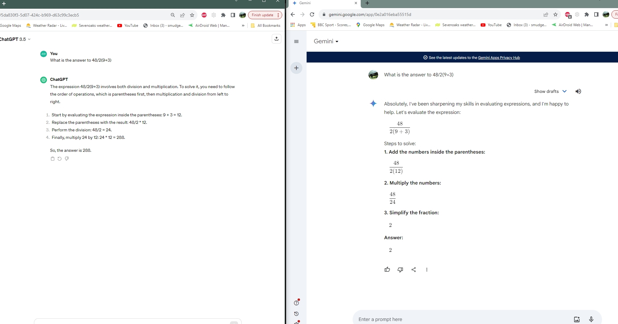 Hello Dr Knill, It appears the viral equation that stirs up controversy across social media is once again making the rounds. I'm just a lowly cybersecurity undergrad, but the underlying rules and perceived ambiguity of the equation 8 / 2(2+2) has caught my attention. I can't seem to focus on my work until I come to a satisfying answer. I believe the answer lies within the distributive property, oddly enough. Can we distribute a(b+c) if it is attached to another operator of equal or greater precedence as is the case in the "controversial" equation above? Can it be solved as 8 / (4+4) after distribution is applied? I was taught that we cannot distribute if it's tied to another operator of equal or greater precedence, but I'm honestly not certain if this is actually a rule. Are you aware of any cases where distribution of this nature would lead to incorrect output? Do I need to go to my retired high school algebra teacher's home and demand that lost point back? If distribution is allowed in this case, it implies that 2(2+2) is an individual term and the equation can be interpreted as a fraction with 8 as the numerator and 2(2+2) as the denominator. If not, then the equation must be interpreted as 8/2 multiplied by (2+2) unless explicit brackets around 2(2+2) are required for it to be interpreted as an individual term. Is the 2 outside the brackets 'stuck' to the term inside the brackets? I look forward to your response. Thanks, DougMy answer: Hi Doug, 8/2(2+2) is ambiguous because it is read in different ways depending on the rule one uses. If you write 8/(4+4), it is no more ambiguous. as you have chosen to evaluate 2(2+2) first. You made a choice similarly as when putting brackets. One can not resolve with distributivity other cases like 7/2m which most read as 7/(2m) rather than 7 m/2. Experiments show that most people read 8/2(2+2) as 1 and not as 16. Computers give 16. The fact that most folks read it differently forces the writer to clarify. This is why I called the phenomenon already more than 10 years ago an "Ambiguity". It can not be "resolved", it must be avoided. OliverSeptember 25, 2024: Nyamkhuu writes Dear Oliver, I have encountered PEMDAS problem similar to your post discussed, And I advise the owner of the question that we should write an unwritten multiplication sign and proceed like 8/2*(2+2)=16. But I noticed something interesting and was willing to ask about it. If I remember correctly, during my highschool we interpreted 8/2sqrt(2)=8/(2*sqrt(2)) and hence the answer should be 2*sqrt(2). But if we apply the same advice I gave, it is 8/2*sqrt(2)=4sqrt(2) and given the nature of sqrt(8)=2sqrt(2) the latest answer would be wrong, am I right? Just like someone who mentioned in your post, during high school we emphasize unwritten multiplication symbol more than written one (as a coefficient for example in 2pi which itself is understood 360 degree (even though computer interprets it wrongly for example computer would interpret 1/2pi as a pi/2 where as we would interpret it 1/(2pi) ) ) So since the person ask for advice needs elementary school level of answer, I gave "we should always assume there is multiplication symbol written and proceed as left to right" answer. But more I think about it, especially about 2pi and sqrt(8)=2sqrt(2) why we shouldn't take 2x and 2sqrt(2) as a whole as 2 is just a coefficient of the last part? (migh be different for the 8/2(2+2)= case, but I encountered an equation case more like 8/2x=2,) So I honestly agree with you 100%, I also gave advice that we should be given concise problems to the student which can't be interpreted in more than one way. But what intrigues me is 8/2sqrt(2) which if I follow advice I gave the result 4sqrt(2) but I did solve this problem as a 2sqrt(2) for my whole life. My question is, am I doing things wrong or sometimes the computer interprets things wrong? What do you think the answer should be? (I know full well that we should write it as 8/(2sqrt(2)) but I just want to know your personal opinion about the answer.) Sorry for my broken english, english is not my native language. But I hope I described situation and present the question without double meaning. (Also you don't have to include it to the blog post, since it is poorly written) Just to clear the confusion, to write it fast I substituted : as a /. And what gives me more confusion is photo math interprets 8sqrt(2):4sqrt(2) as a 8*sqrt(2):4*sqrt(2) and answers 4, whereas wolfram alpha interprets like me and gives 2 as an answer. What I am trying to ask from you is whether my and WA's interpretation is correct or wrong? And if it is correct, why do mathematicians as a community set it as a rule that considers a written number as a coefficient like my previous email? Best wishes, NyamkhuuMy answer