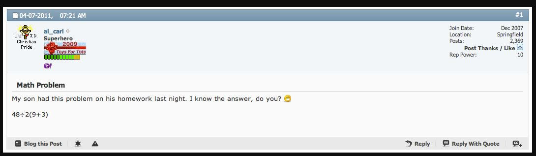 A potential solution for this controversy could be that when you have coefficients and variables written together without operators between them, e.g. 5ab, we should be able to treat this as a nested operation. In other words, the lack of an operator symbol implies that the relationship between them takes precedence over any operations outside, i.e. 5ab represents (5 * a * b). So if you had a / bc, there is only one operator written (the division symbol), and the "bc" part would be implied to be nested because of the omission of the operator within. So it would still be "a over bc," exactly what it looks like and how many of us were taught. And then if we need to signify that the operation between a and b actually takes precedence over the relationship between b and c, then we would just write a / b * c instead. No fuss, no muss. Isn't that a much more efficient way of communicating with the mathematical language here? And isn't that the point of a mathematical language, to communicate concepts effectively? Otherwise this kind of confusion will never go away, and we will have to write a lot more parentheses in our equations (and nobody wants to do that). Some people like the "new math" of the super strict PEMDAS interpretation specifically because it is an easy way to trick people and make the math more convoluted than it needs to be. Yet that seems to defeat the entire point of why we do this stuff in the first place. I get both ways of doing it, but the strict PEMDAS method seems counterproductive because it causes so many problems, and it does things like making an ostensibly simple fraction like 2x / 3y into actually meaning 2xy / 3 instead, which seems completely insane. But if instead we just use PEMDAS when the operators are actually written, then all of these kinds of problems would literally vanish overnight. The "old math" and the "new math" would finally agree, and we could accomplish it all with one very simple rule. What do you think about that?I wrote back