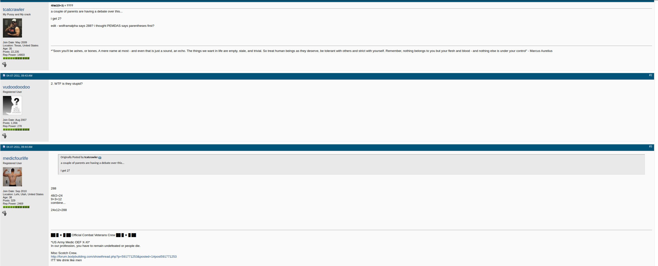 "yes, it is an interesting thing. None of the answers is of course "correct" as we know that both the BEDMAS and PEMDAS interpretations can be used without violating any authority. As indicated on the page, the answer 11 is what most computer languages get. You were obviously taught that. It would be interesting to know what percentage of humans say 11. My experiments say that it is very rare. Most do the multiplication before division as PEMDAS seems to be more popular and more taught in schools. BEDMAS of PE(MD)AS appears to be taught much less. The only thing we know is that the claim that one of the answer is the only right answer, is wrong."