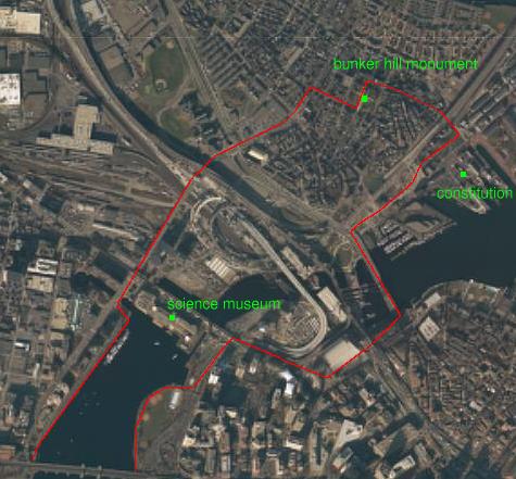 back on the other side. A variant of this river run, which is not so widely used is to continue the river trail from the science museum, pass the bunker hill monument and from there, follow the historical "red line" to boston. The run passes the "constitution" battle ship. The runner can now make a round trip back to the science museum. |