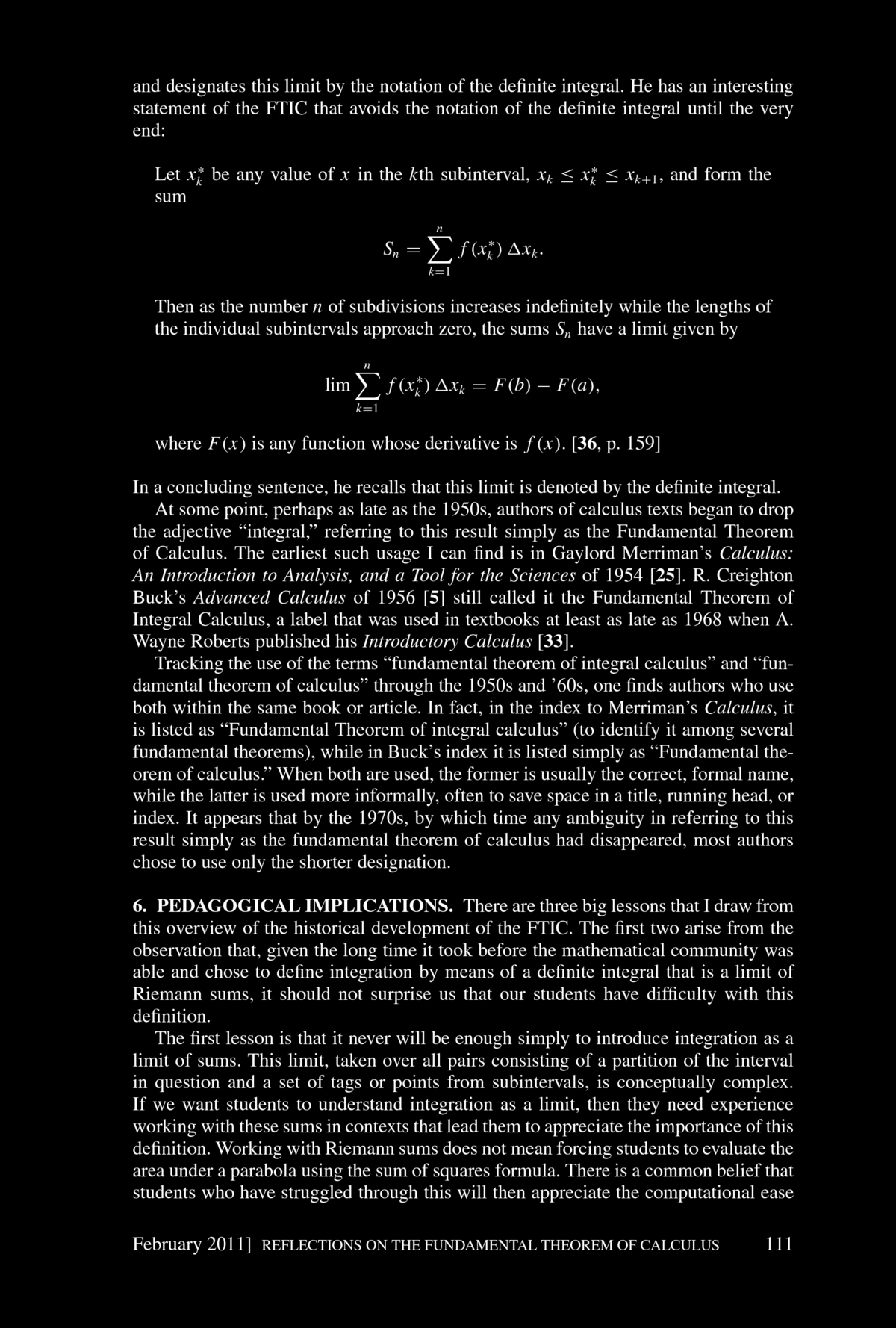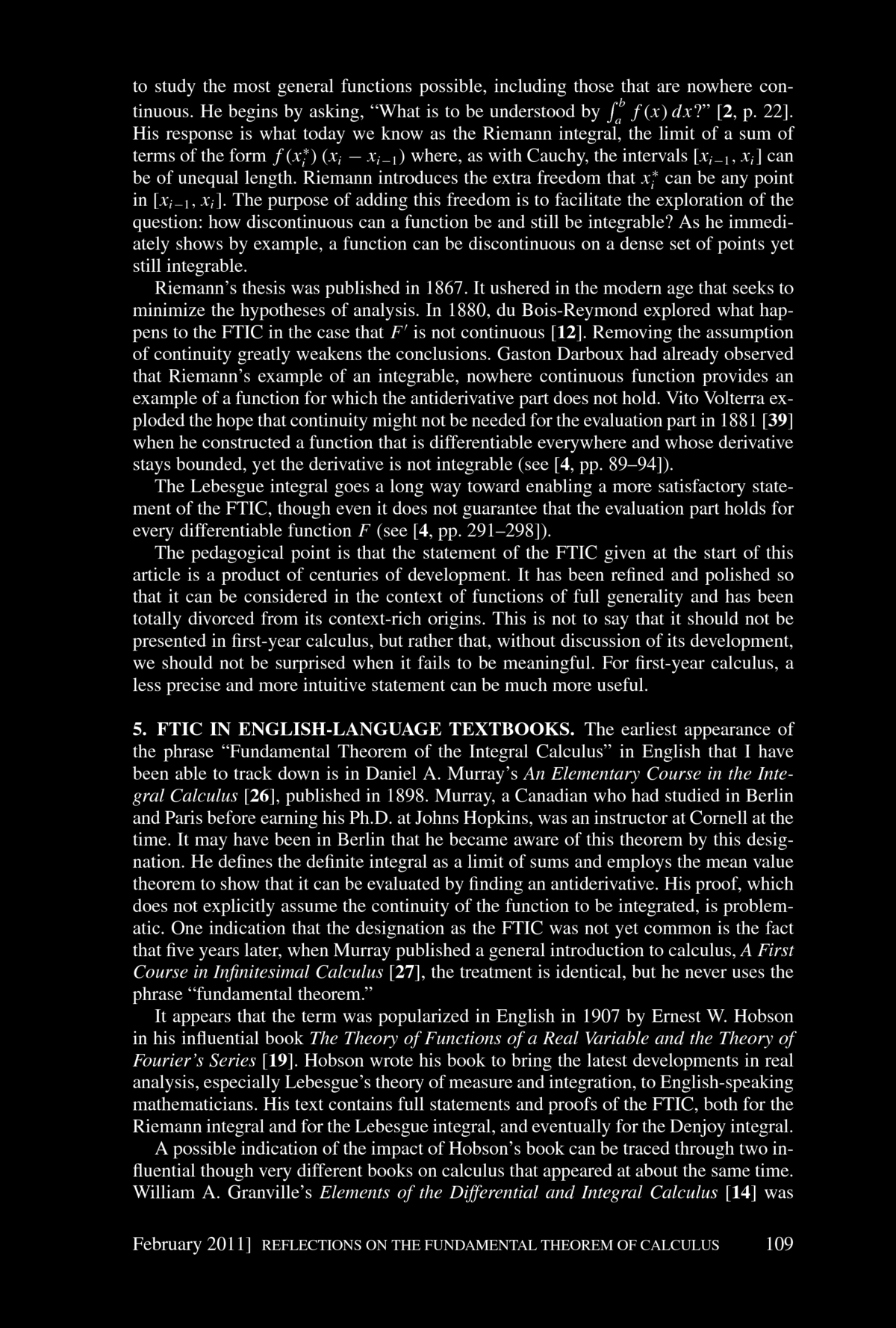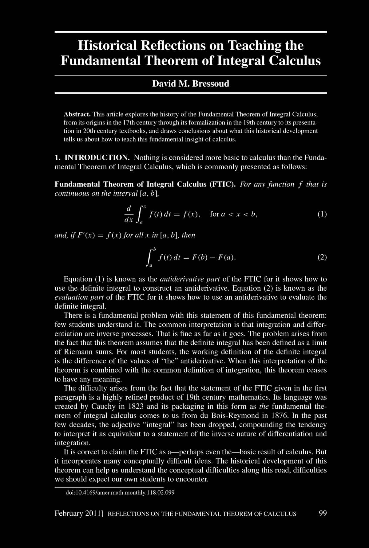 fundamental Theorem of Integral Calculus". You find the article below. Bressoud concludes his article with: