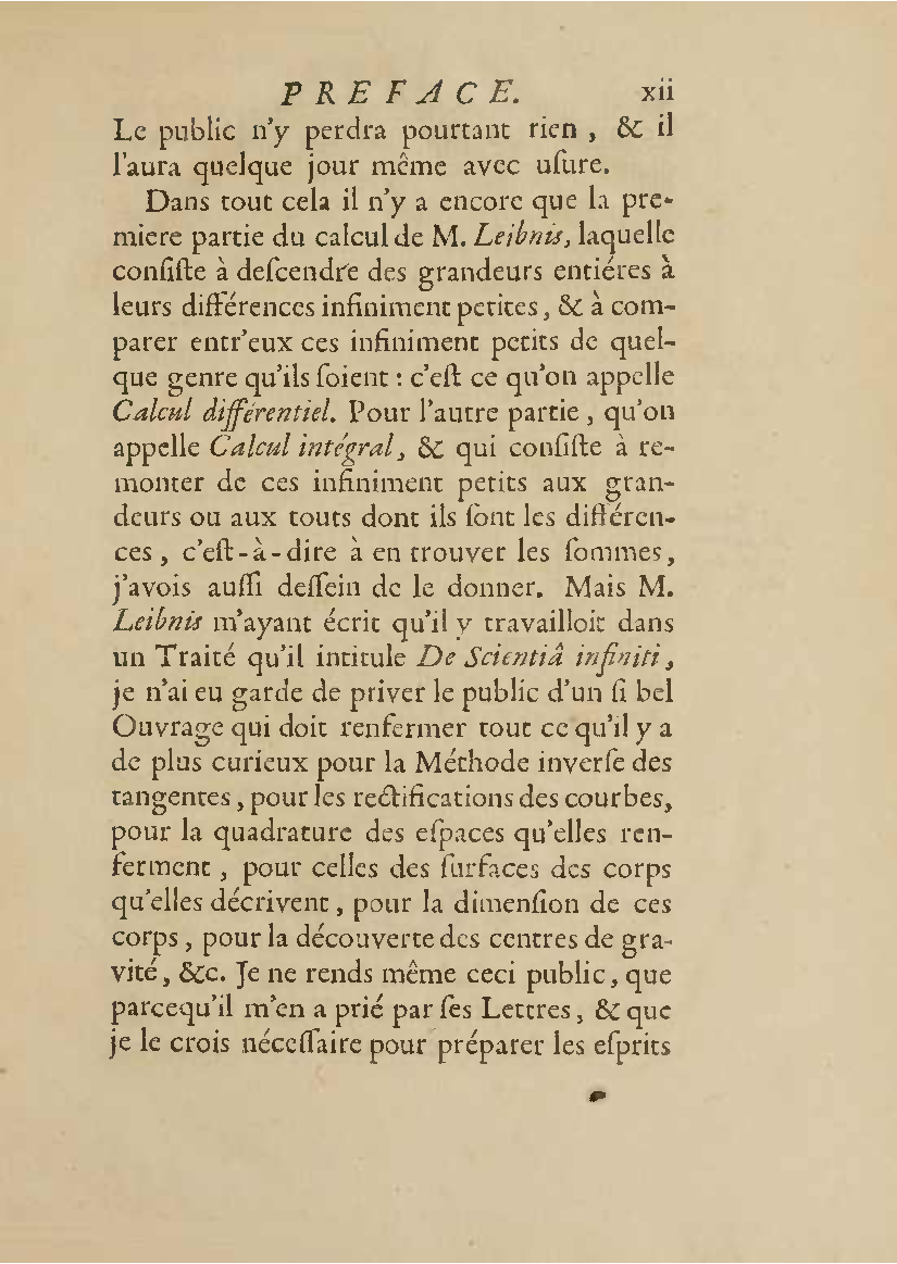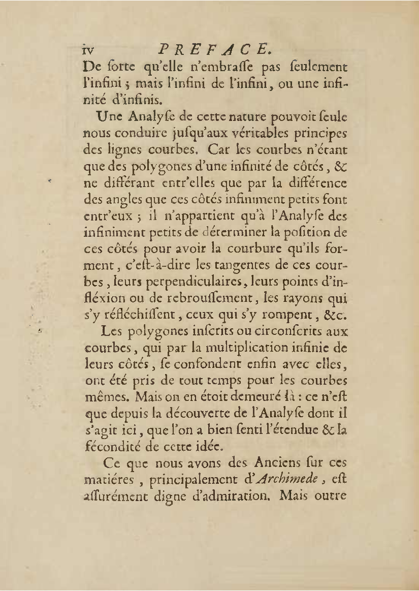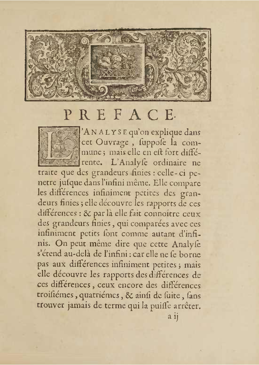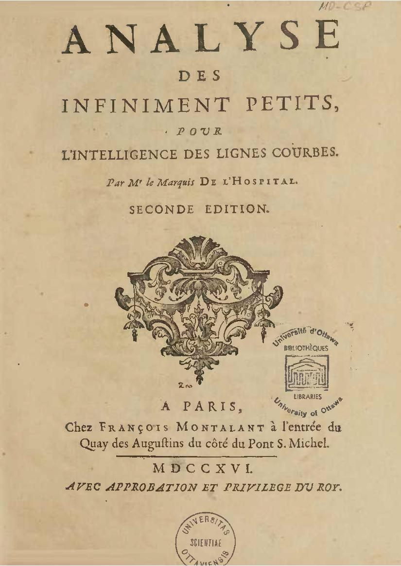 Analyse des infiniment petits, pour l'intelligence des lignes courbes Par Mr le Marquis de L'Hospital. L'analyse qu'on explique dans cet ouvrage, suppose la commune; mais elle en effort differente. L'analyse ordinaire ne traite que des grandeurs finies : celle-ci penetre jusque dans l'infini meme. Elle compare les differences infiniment petites des grandeurs finies; uelle decouvre les rapports de ces differences et par la elle fait connoitre ceux des grandeurs finies, qui comparers avec ccs infinimeurs petits font comme aucanc d'infinis. On peut meme dire que dire que cette Analyse s'etend au-dela de l'infini: car elle ne se borne pas aux differences infiniment pecites ; mais elle decouvre les rapporcts des differences de ces differences, ceux encore des differences troisiemes, quatriemes et ainsi de suite, sans trouver jamais de terme qui qui puisse arreter. De forte qu elle n'embrasse pas seulement l'infini; mais l'infini de l'infini, ou donc infinite d'infinis. PDF (I removed some empty pages from the source). |