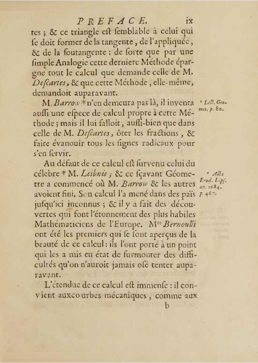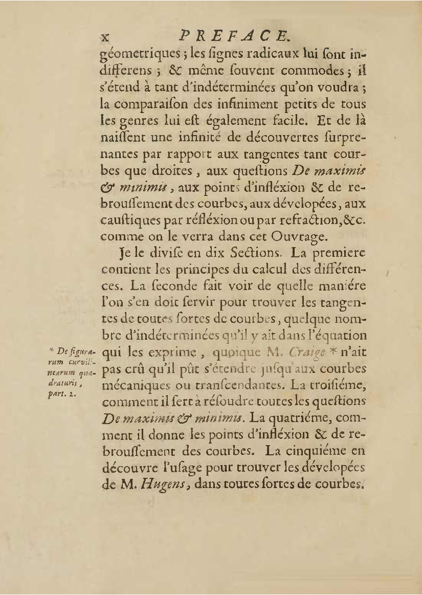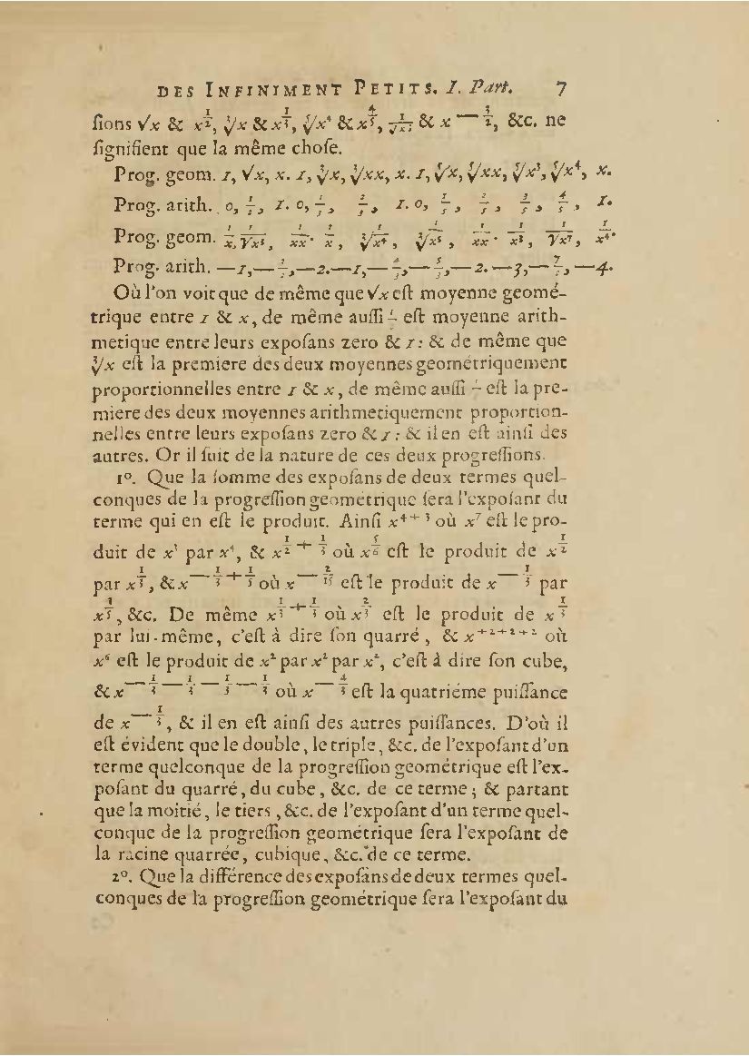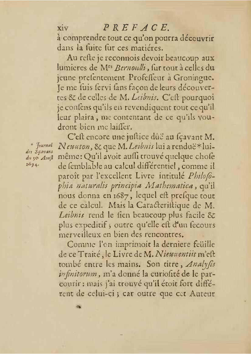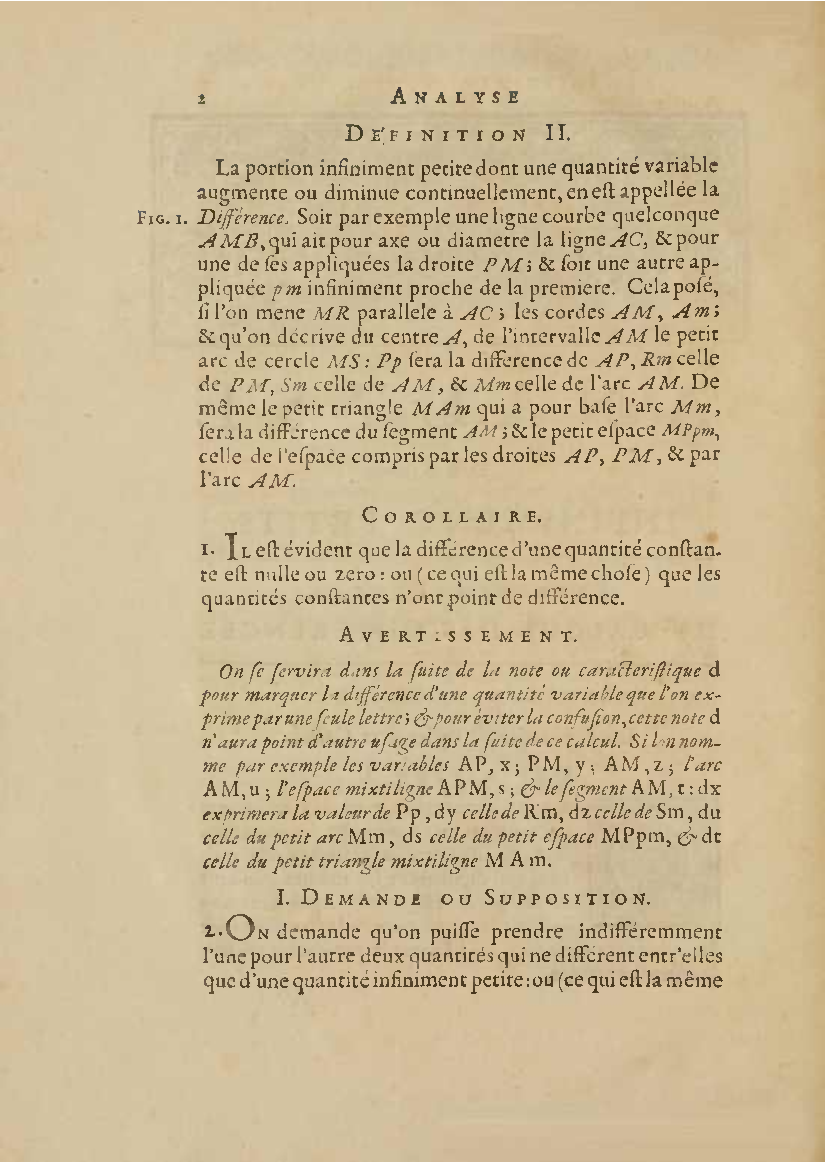 Analyse des infiniment petits, pour l'intelligence des lignes courbes Par Mr le Marquis de L'Hospital. L'analyse qu'on explique dans cet ouvrage, suppose la commune; mais elle en effort differente. L'analyse ordinaire ne traite que des grandeurs finies : celle-ci penetre jusque dans l'infini meme. Elle compare les differences infiniment petites des grandeurs finies; uelle decouvre les rapports de ces differences et par la elle fait connoitre ceux des grandeurs finies, qui comparers avec ccs infinimeurs petits font comme aucanc d'infinis. On peut meme dire que dire que cette Analyse s'etend au-dela de l'infini: car elle ne se borne pas aux differences infiniment pecites ; mais elle decouvre les rapporcts des differences de ces differences, ceux encore des differences troisiemes, quatriemes et ainsi de suite, sans trouver jamais de terme qui qui puisse arreter. De forte qu elle n'embrasse pas seulement l'infini; mais l'infini de l'infini, ou donc infinite d'infinis. PDF (I removed some empty pages from the source). |