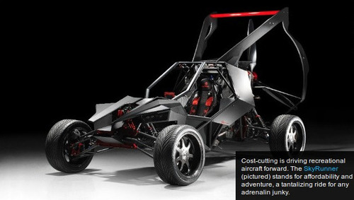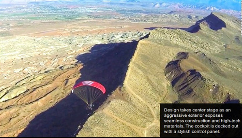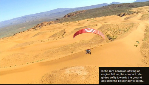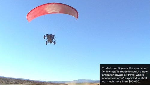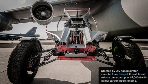 This week at the Farnborough International Airshow, Parajet is showcasing the SkyRunner to potential aviation distributors with a price tag of ,000. The design combines an all-terrain vehicle with a light sport aircraft capable of soaring 15,000 feet at a speed of 55mph, with a flying time of three hours. Powered by an innovative low-carbon petrol engine, the hybrid is presented as "the next generation of recreational aircraft...designed primarily to make aviation easily accessible and fun." The vehicle has undergone testing over five years, including a voyage from London to Timbuktu flown by inventor Gilo Cardozo. It builds on the motor design of the company's signature product, a propeller-powered jetpack already established on the market.