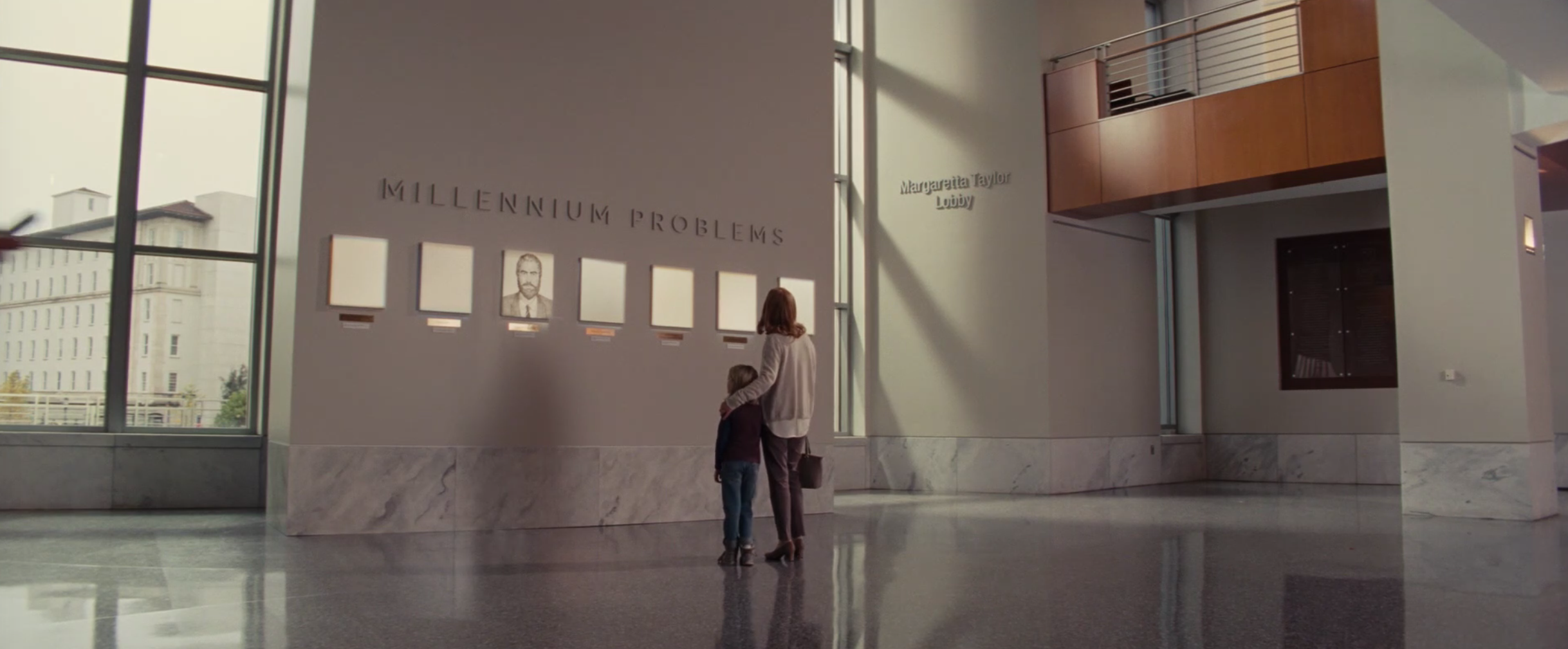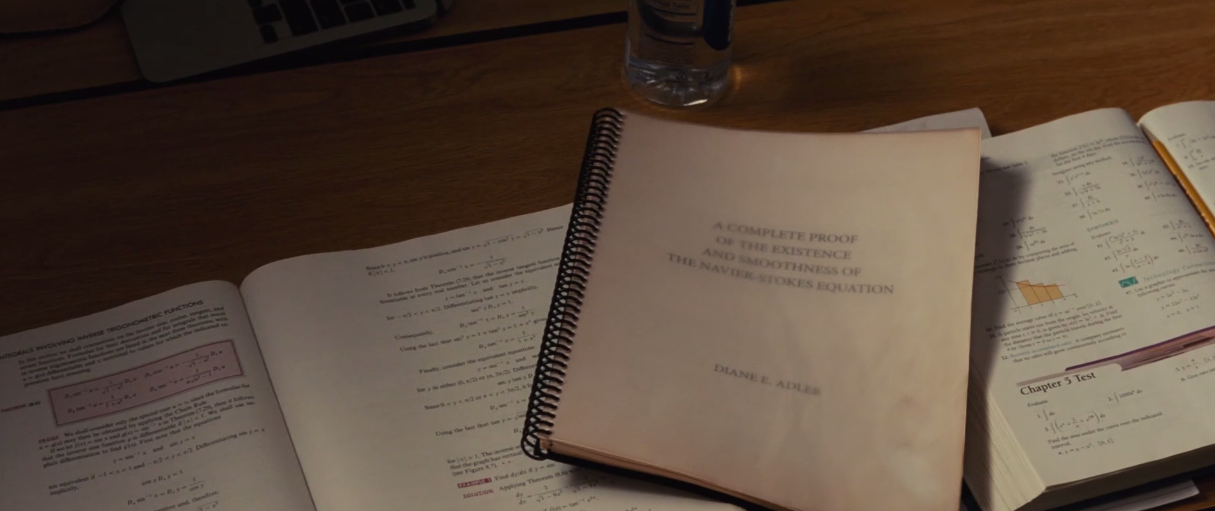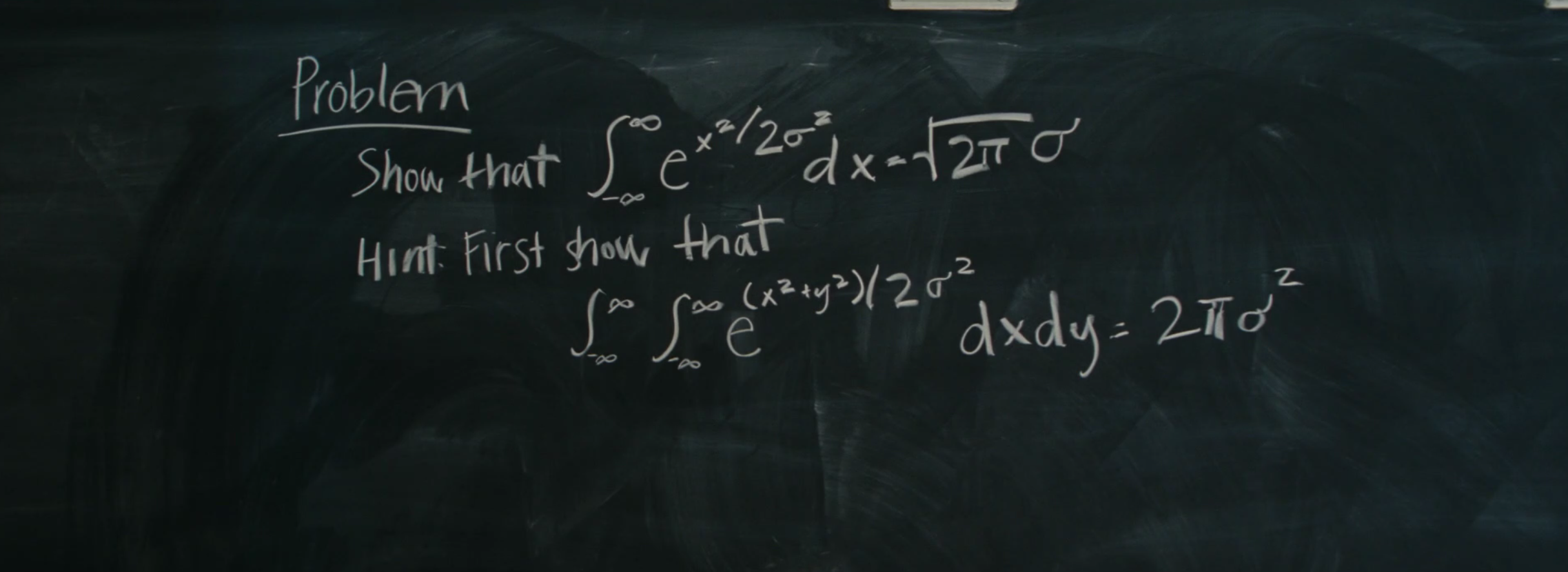 We see a calculus book, the millenium problems and a blackboard problem needing polar coordinates for integration. See some clips