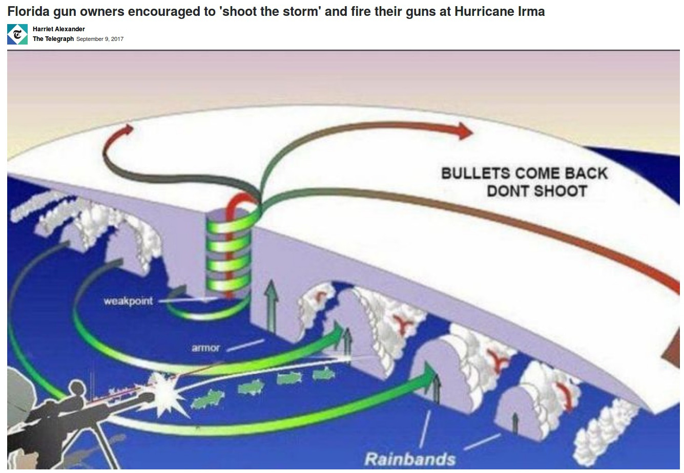 Ryon Edwards, 22, came up with a novel way of amusing himself during the storm: firing bullets into it. The idea caught on. After 50'000 people have on facebook expressed interest in such a shooting event, Florida police quickly warned people not to fire their weapons at Hurricane Irma however:"To clarify, DO NOT shoot weapons @ #Irma. You won't make it turn around & it will have very dangerous side effects," the Pasco Sheriff's office tweeted.