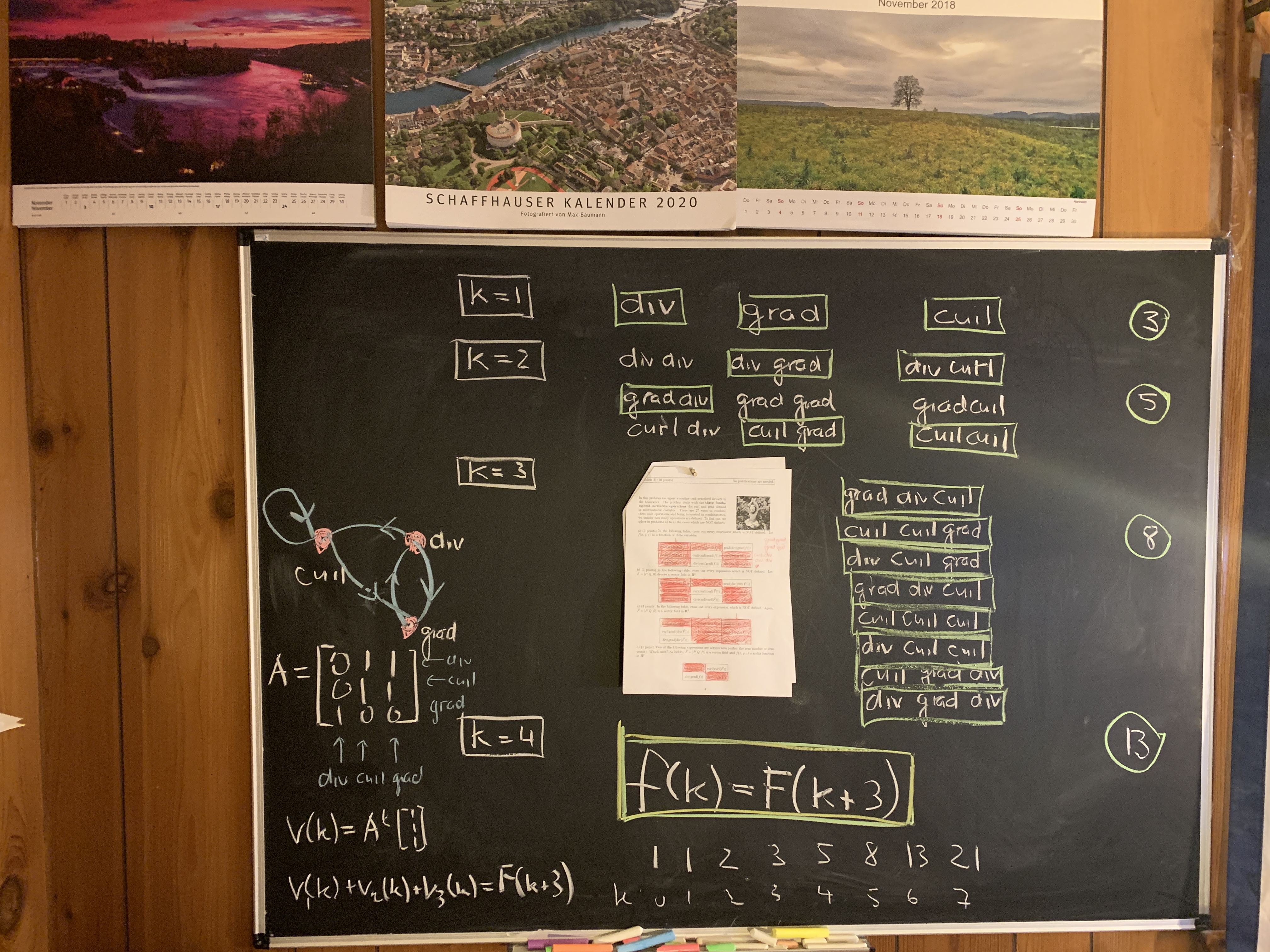 In the final exam in problem 3, we looked at all 27 cases to combine the differential operators div curl and grad. We have had quite a few discussions internally whether this is an appropriate problem. Grinding through many cases is not considered enlightening in general. But there are reasons. The case leads to an interesting combinatorial problem: