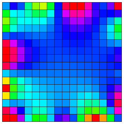 | As an example of a system with many variables, consider a drum modeled by a fine net. The heights at each interior node needs the average the heights of the 4 neighboring nodes. The height at the boundary is fixed. With n2 nodes in the interior, we have to solve a system A x=b of n2 equations. The problem solved here is a discrete version of the Dirichlet problem, which we will see later in class and solve explicitly. |