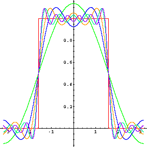 | Each of the three color channels of a picture can be realized as a function f(x,y) of two variables. These three functions red(x,y), green(x,y), blue(x,y) determine the picture. The Fourier coefficients of functions of two variables are defined similarly as in one dimension. The one dimensional integral becomes a double integral. As a basis, one can take fn,m = exp(i n x) exp(i m y) as well as their real analogues. The animation shows the first 70 Fourier approximations to a picture of dimensions 150 times 150 pixels. (While this could be done easily in Mathematica also, the animation here has been produced with a little standalone C program.) You can also observe the Gibbs phenomenon here. The JPG compression standard uses discrete cosine transform on blocks of 8 x 8 pixels. |