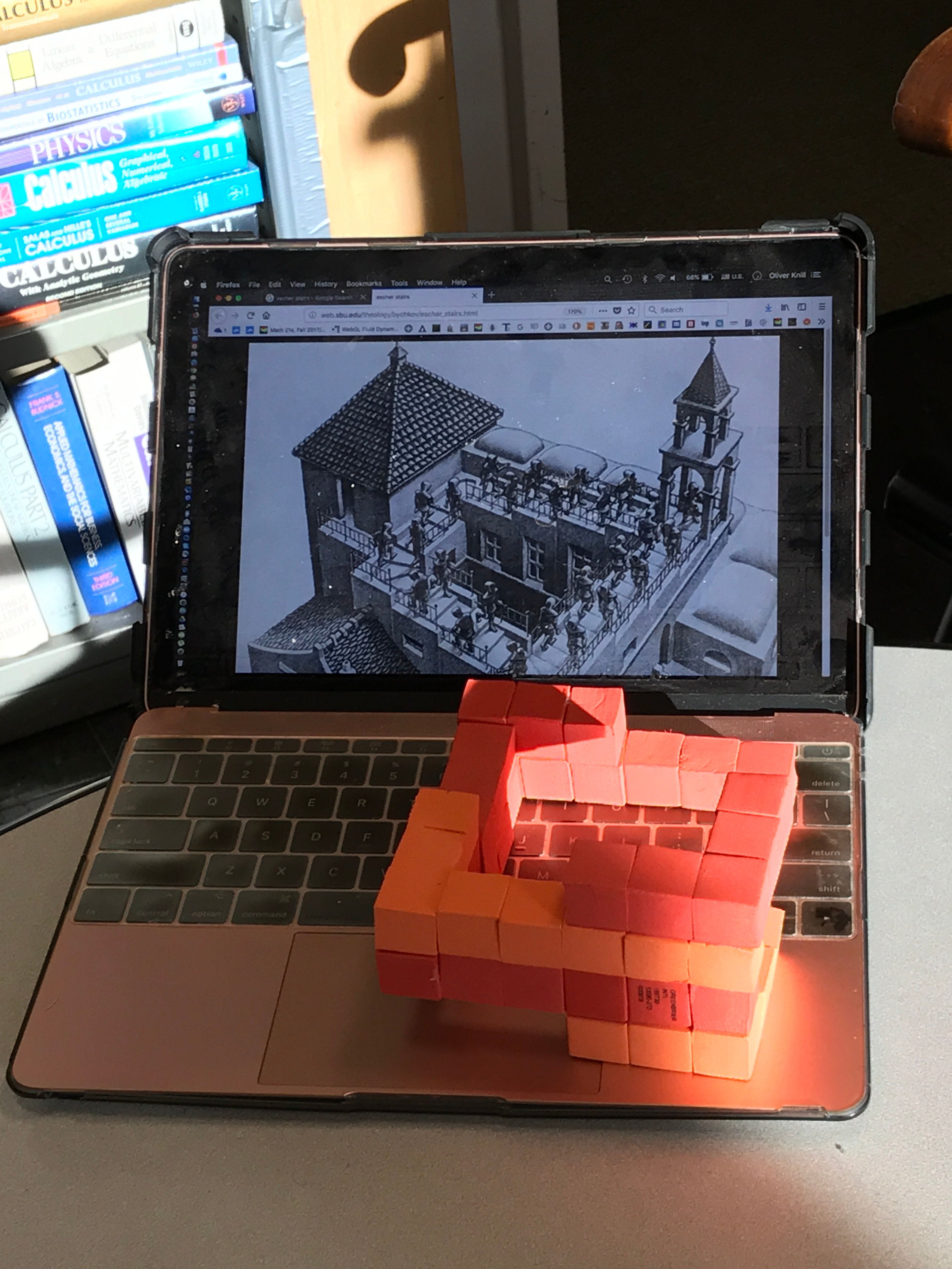 Glen Whitney teaches currently a course MATH 168 - "Making Math Material". I'm not in his class, but Glen just gave me some cubes to experiment. Here are Escher stairs built with these cheap material. No 3D printing needed, just a little bit of tape and these cubes.