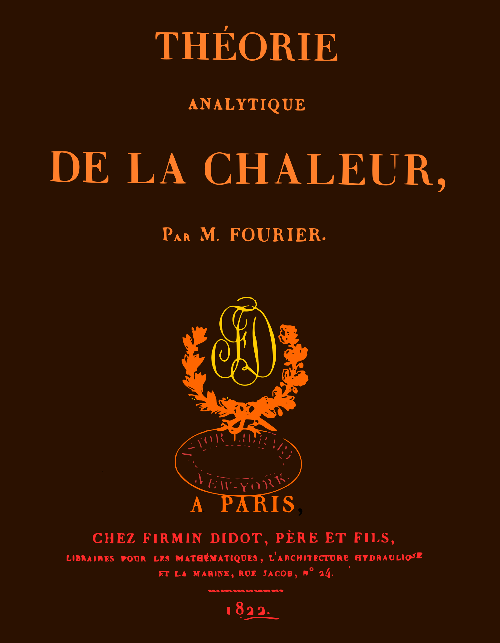 | Jean-Baptiste Joseph Fourier wrote his book "Théorie Analytique de la chaleur" in 1822. He was 54 years old then. Fourier was from 1798 to 1801 as an scientific advisor of Napoleon on the ``Egyptian expedition". A contingent of 167 scientists and scholars were coming with Napoleon, among them the Mathematicians Fourier and Monge. One knows now that some of the empirical work which later led to the "Theorie of heat" was founded in Egypt. Scientifically, the expedition led to some progress in the understanding of the hieroglyphs, in particular the discovery of the Rosetta stone in 1799. The trimmed version got also passed through optical character recognition (OCR) so that it is searchable although the program had some difficulty with the french language. |