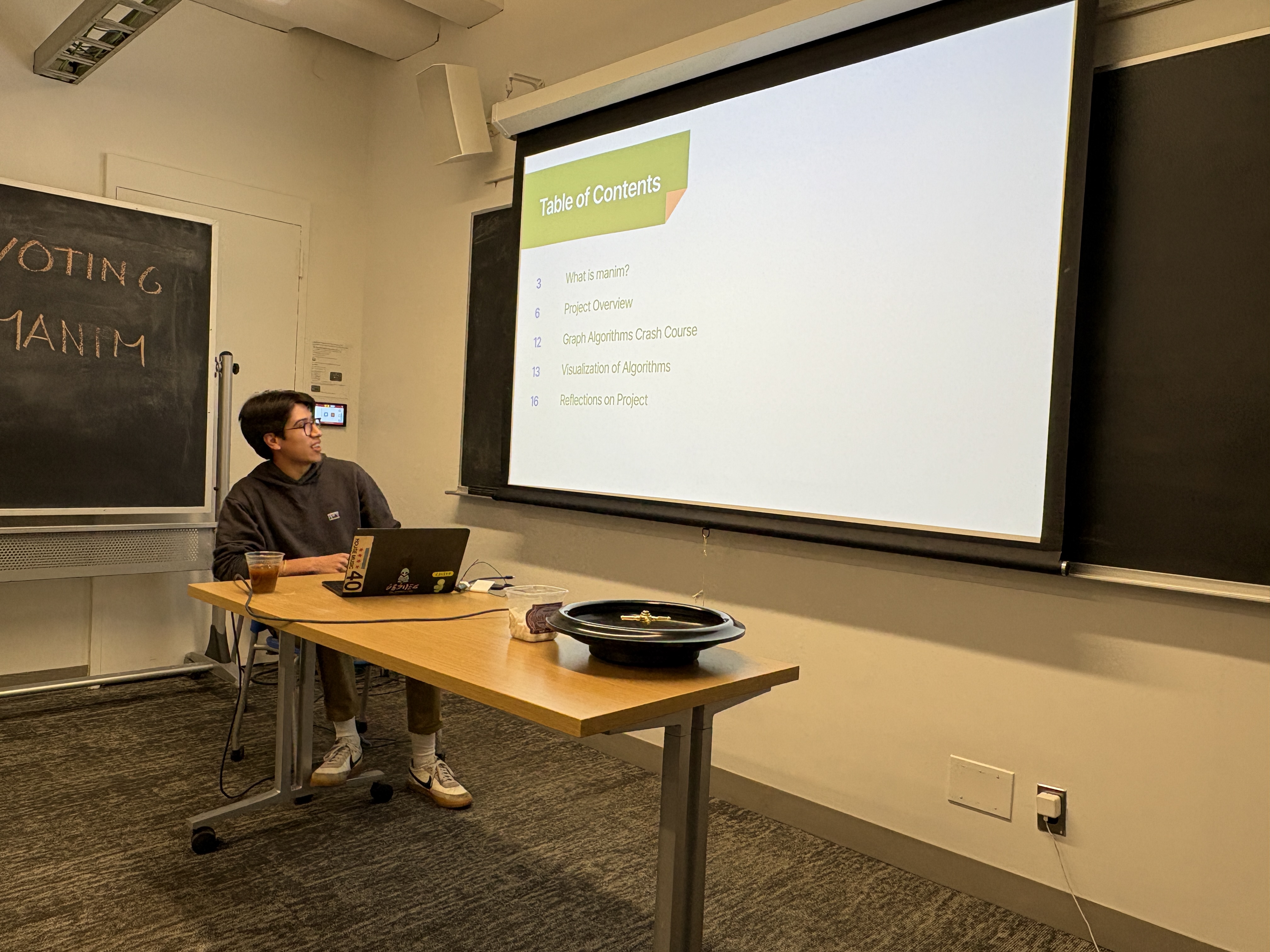 | In the 12th meeting, Hugo and Emily presented. Hugo taught us about Manim (the open source math visualization library in Python) and Emily explained us how to "Gamify the Vote" and how to visualize it using the Sankey Diagram. |
