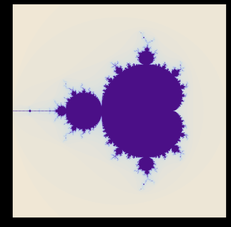 M=Compile[{x,y},Block[{z=x+I y,k=0},While[Abs[z]<2&&k<50,z=z^2+x+I y;++k];k]];