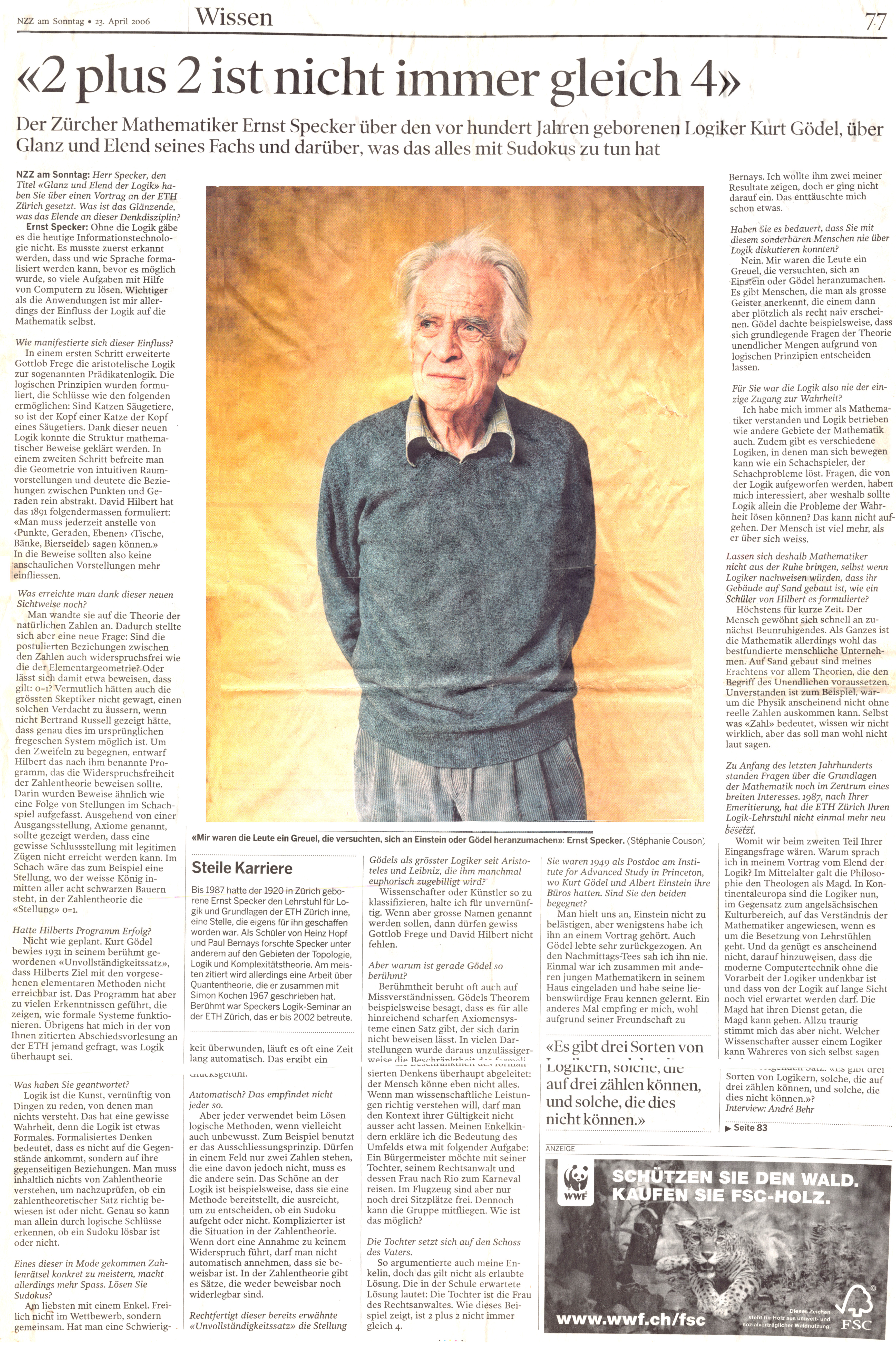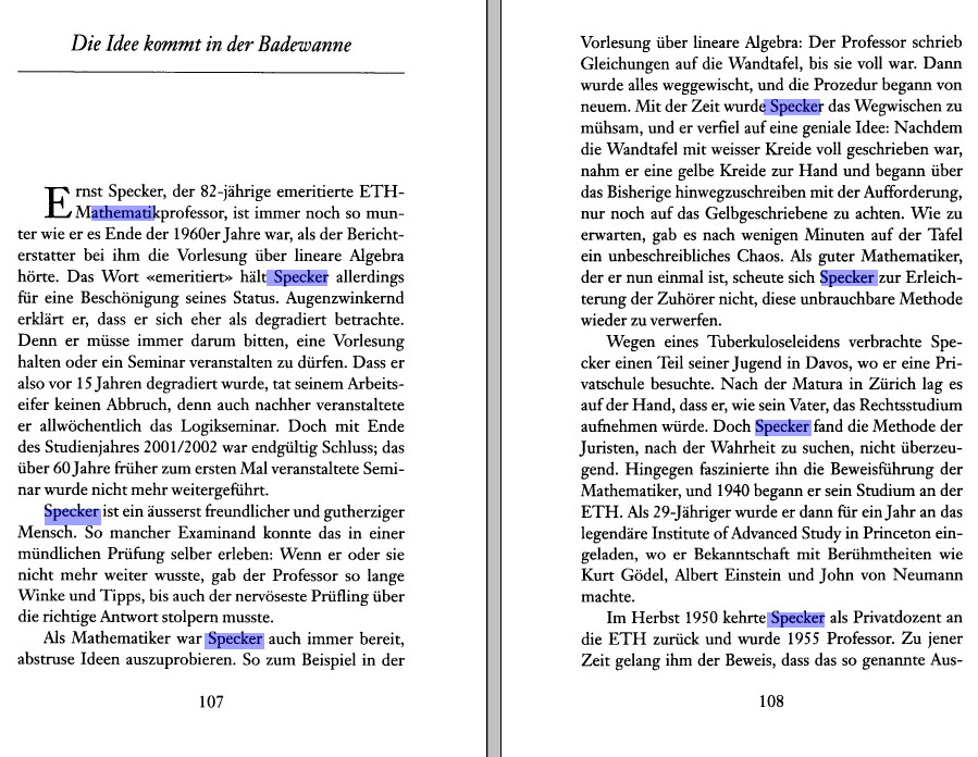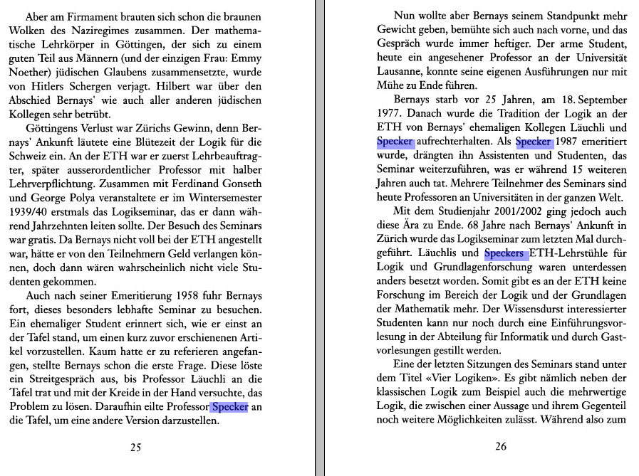 While preparing for the Set and Logic lecture, I found in a logic book the following article about Specker in the NZZ. Specker is probably best known for the Kochen-Specker theorem, which is also of great interest to a general public as it deals with a fundamental property of quantum mechanics. See Section 218 in my current list of fundamental theorems.- My Boston Talk of 2015 mentions a story about Specker (also my Lin alg teacher at ETH) and Läuchli (also my analysis I,II (calculus) teacher at ETHZ). (see a list of courses. Specker liked to play with the class or challenge it with riddles. Here is a page on an assignment to write down the definition of the smallest 10 dimensional vector space.
