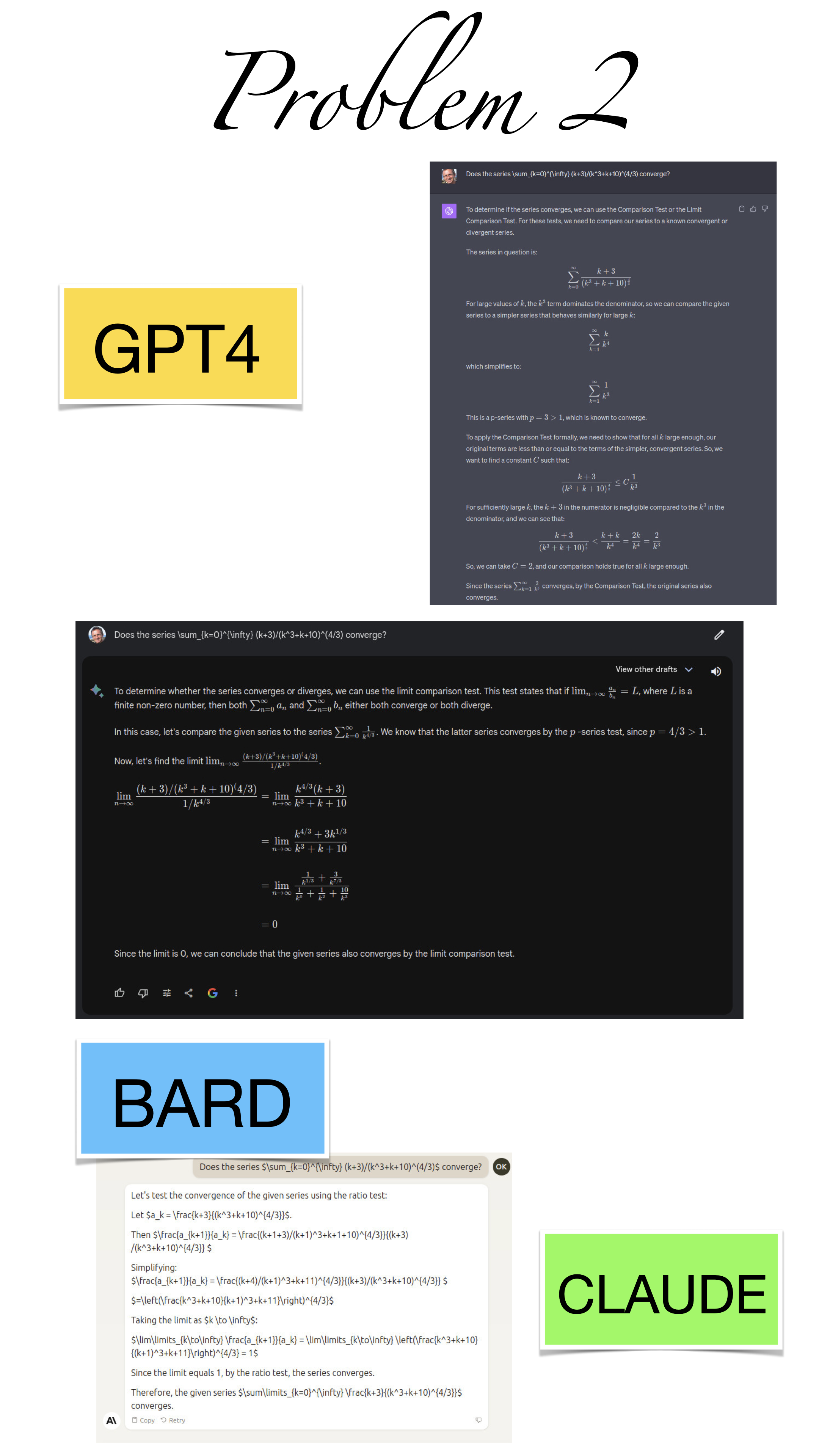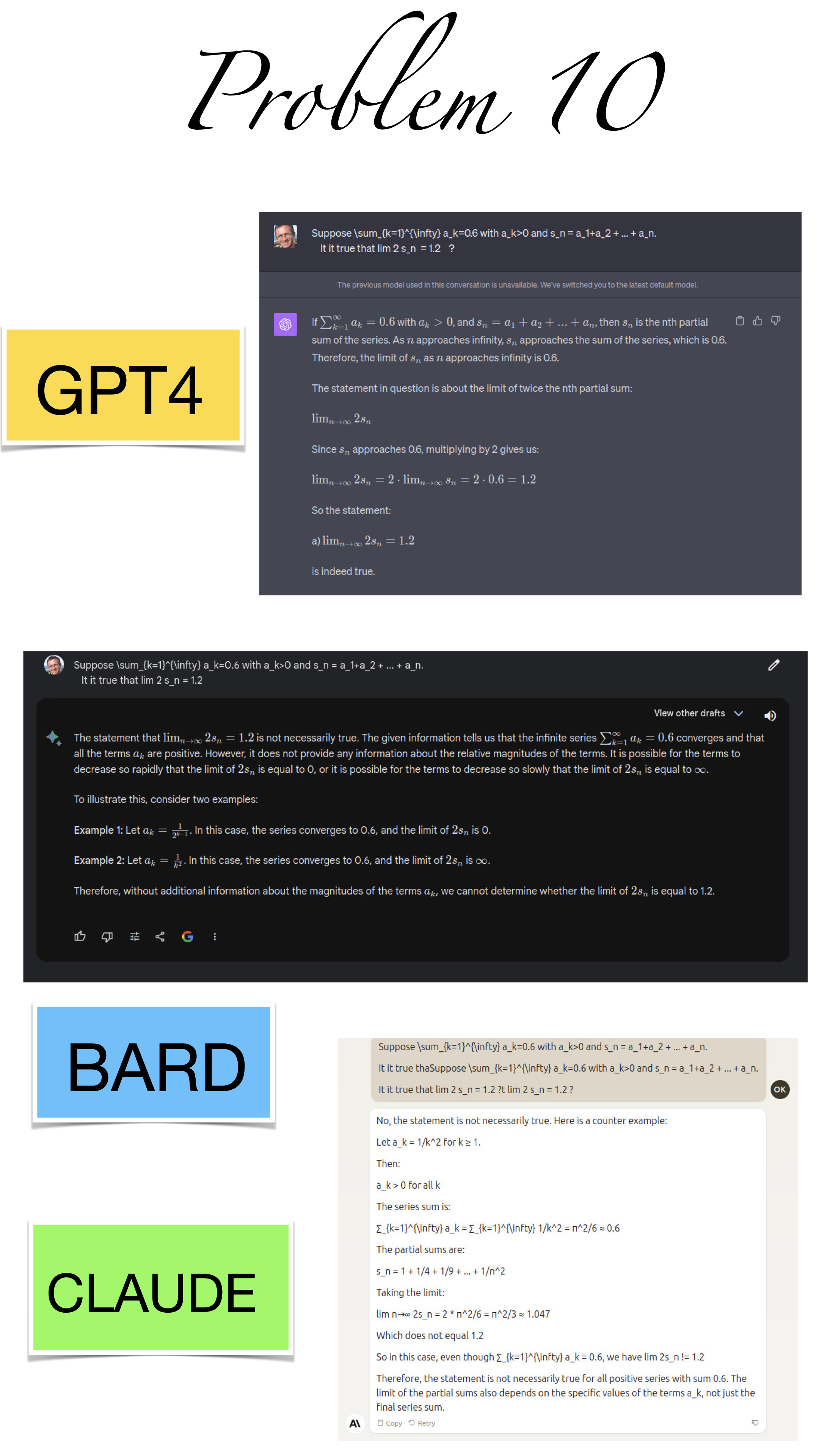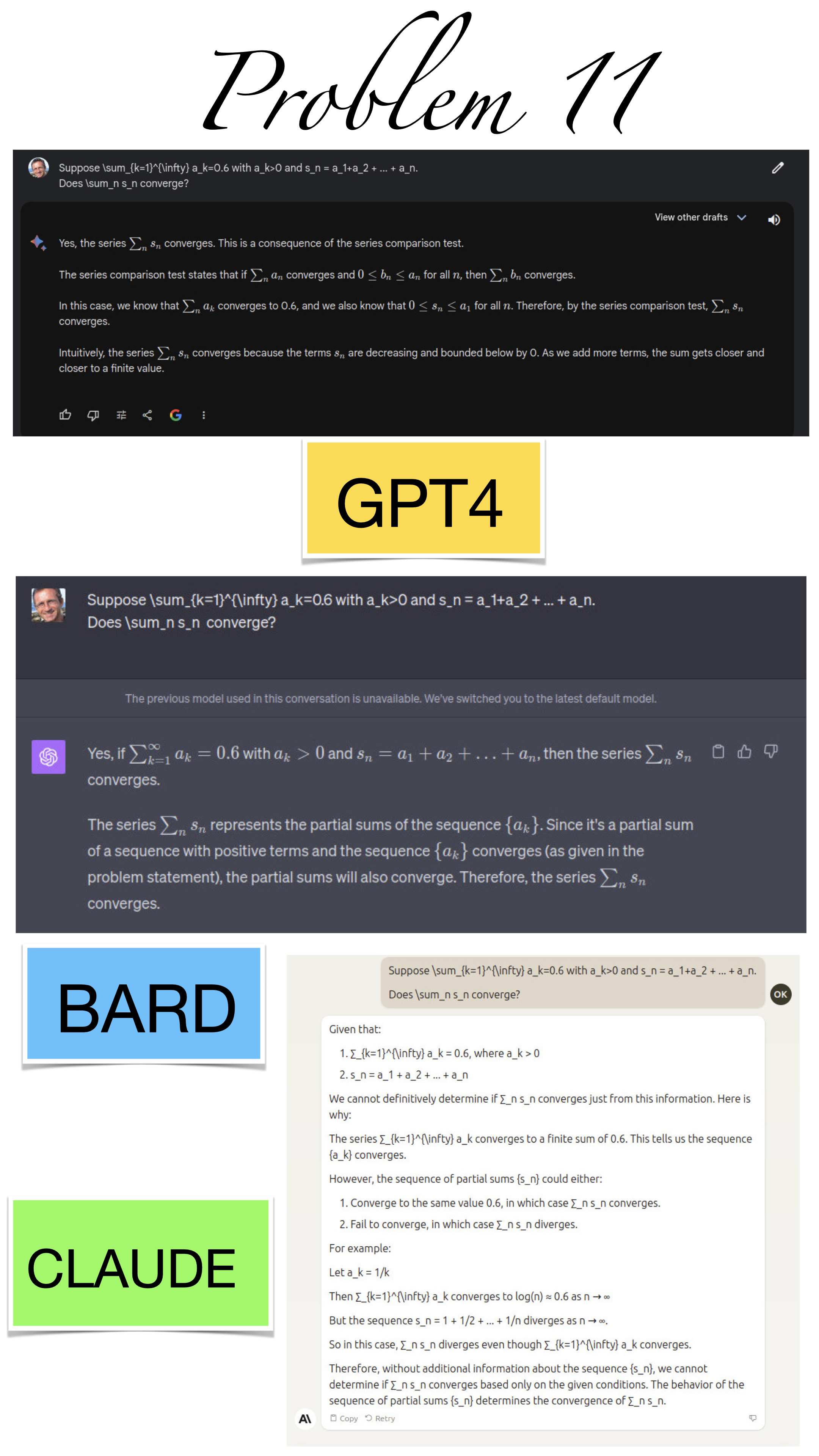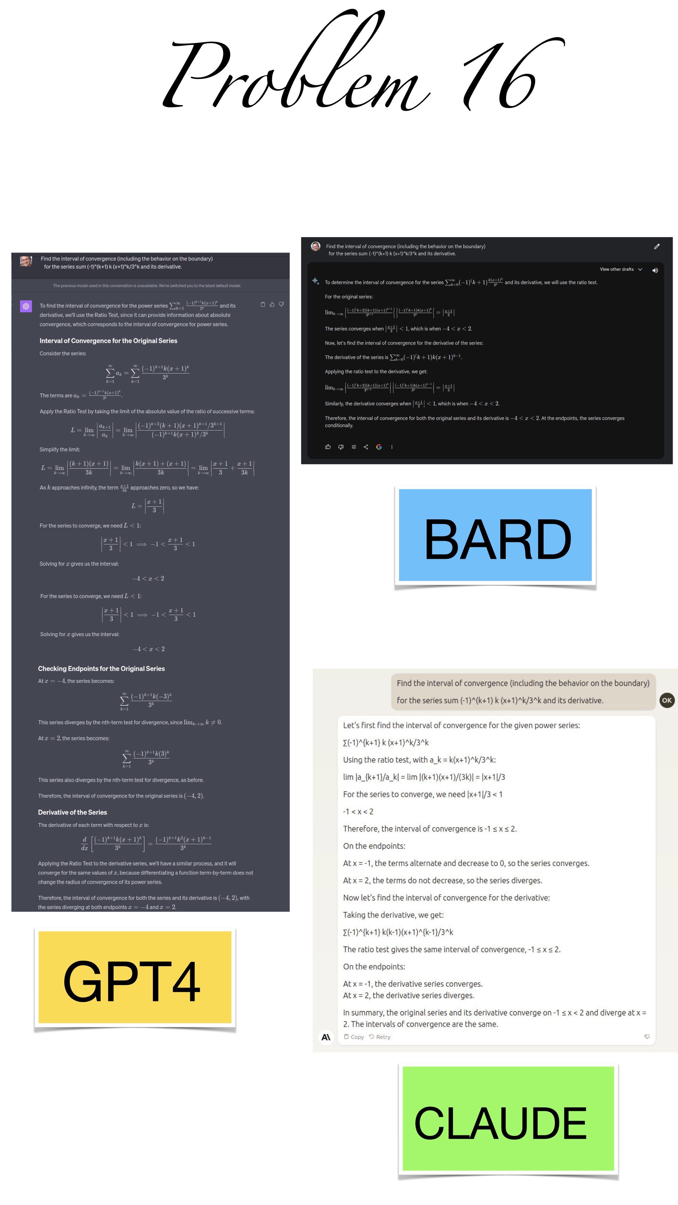 | Here are the pictures of the 1 minute short done before the second midterm in Math 1b. Three bots, GPT4, BARD, CLAUDE competed. I made a 35 frame slide show for that. The 1 minute short contains also the output captured from what the bots told. It can be inspected more closely here. Click onto a slide to see it large. |