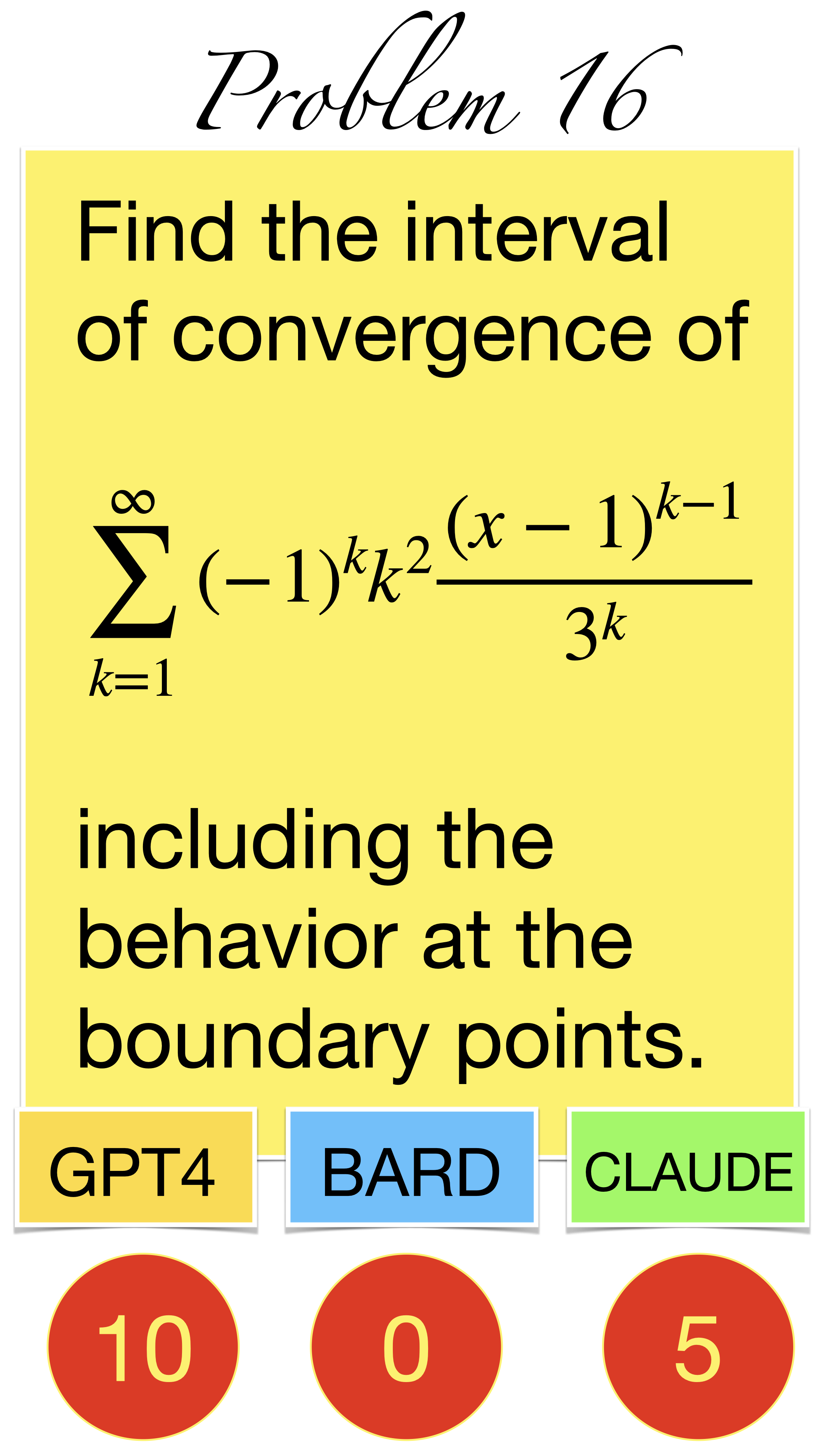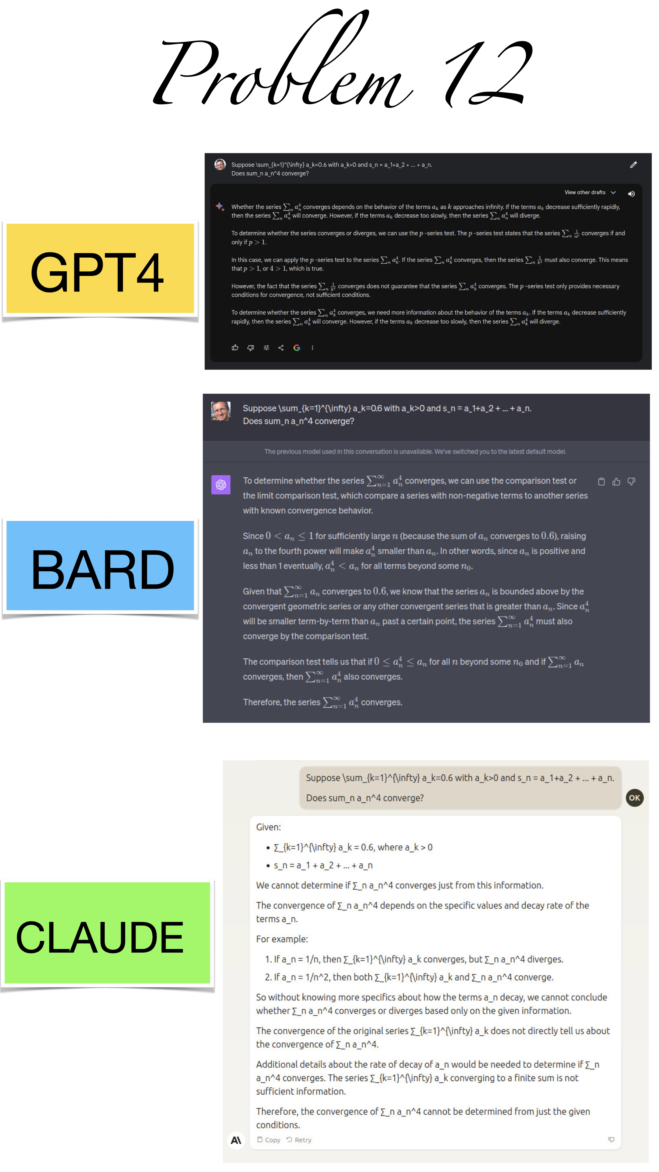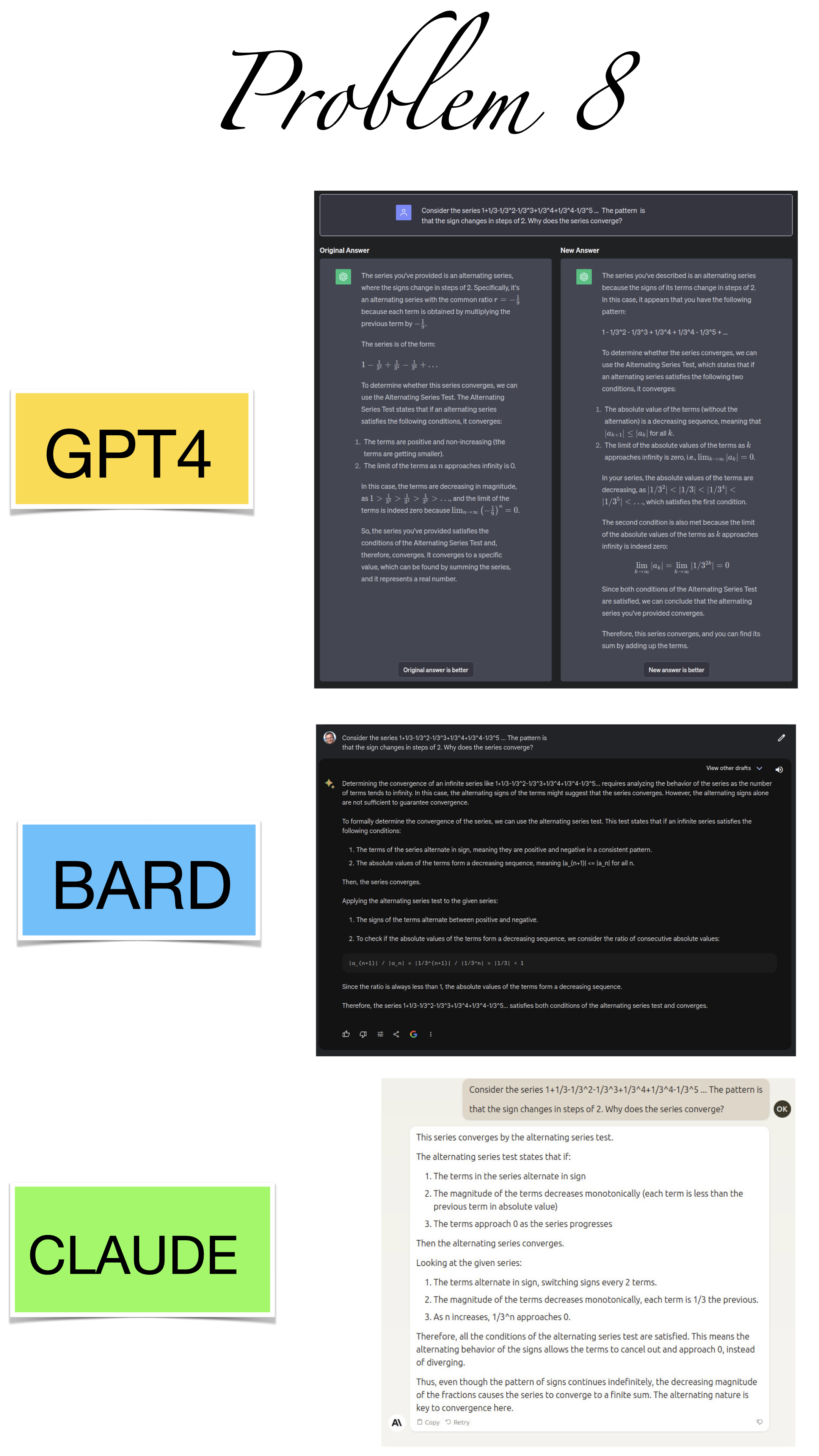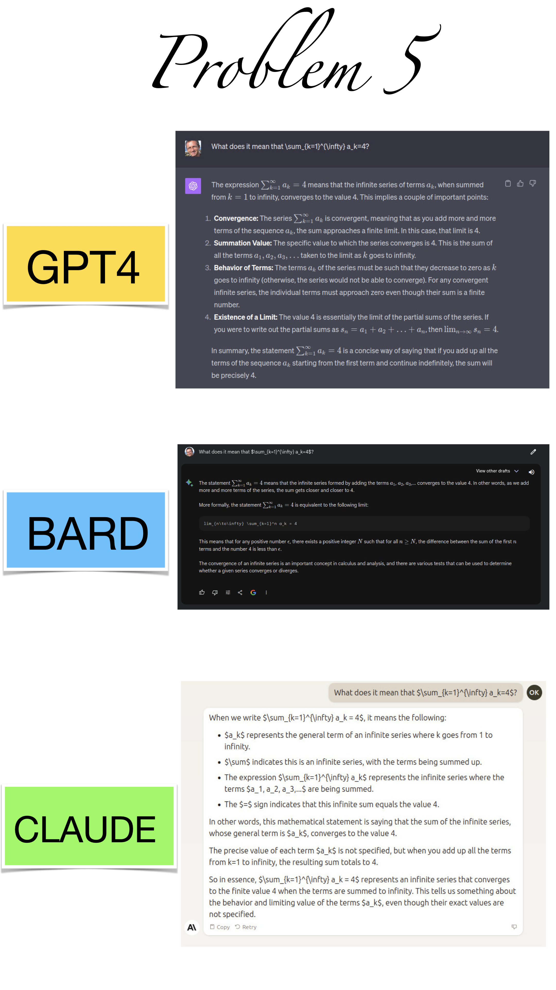 | Here are the pictures of the 1 minute short done before the second midterm in Math 1b. Three bots, GPT4, BARD, CLAUDE competed. I made a 35 frame slide show for that. The 1 minute short contains also the output captured from what the bots told. It can be inspected more closely here. Click onto a slide to see it large. |