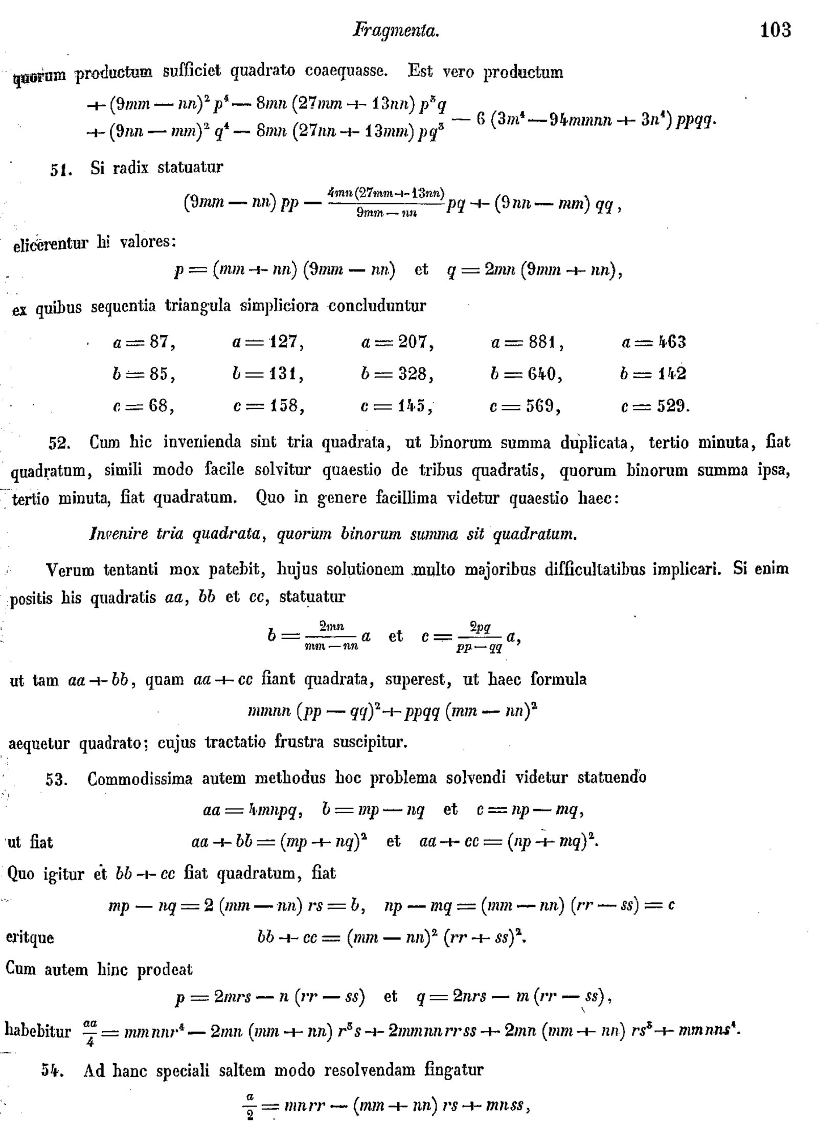 Leonard Euler, E799 -- Fragmenta commentationis cuiusdam maioris, de invenienda relatione enter latera triangulorum, quorum area rationaliter exprimi possit, et de triangulo in quo rectae ex singulis angulis latera opposita bisecantes sint rationales