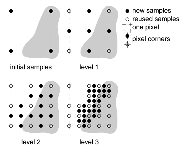 The second, adaptive, recursive super-sampling method starts by tracing four rays at the corners of each pixel. If the resulting colors differ more than the threshold amount additional samples will be taken. This is done recursively, i.e. the pixel is divided into four sub-pixels that are separately traced and tested for further subdivision. The advantage of this method is the reduced number of rays that have to be traced. Samples that are common among adjacent pixels and sub-pixels are stored and reused to avoid re-tracing of rays. The recursive character of this method makes the super-sampling concentrate on those parts of the pixel that are more likely to need super-sampling (see figure below).