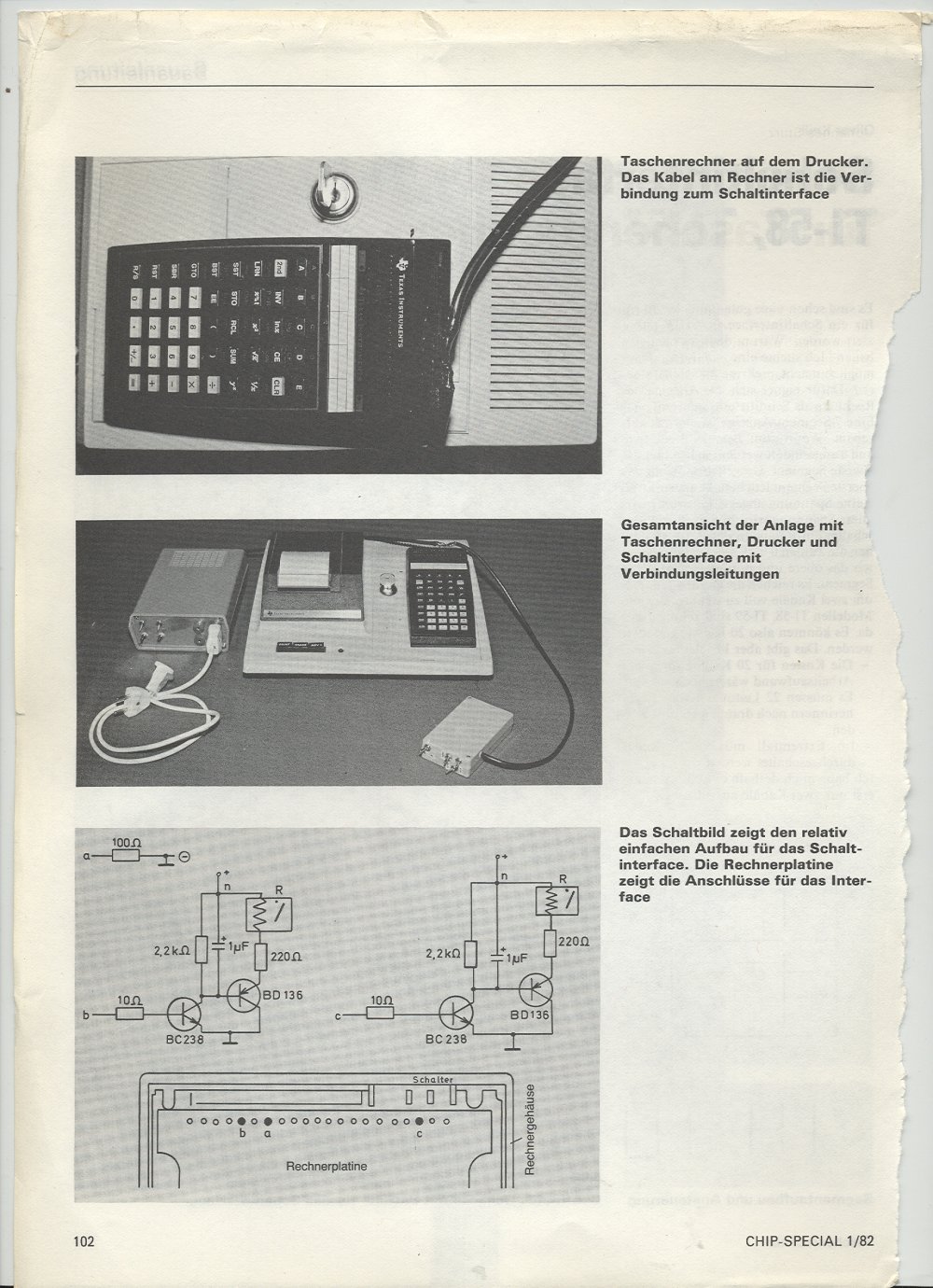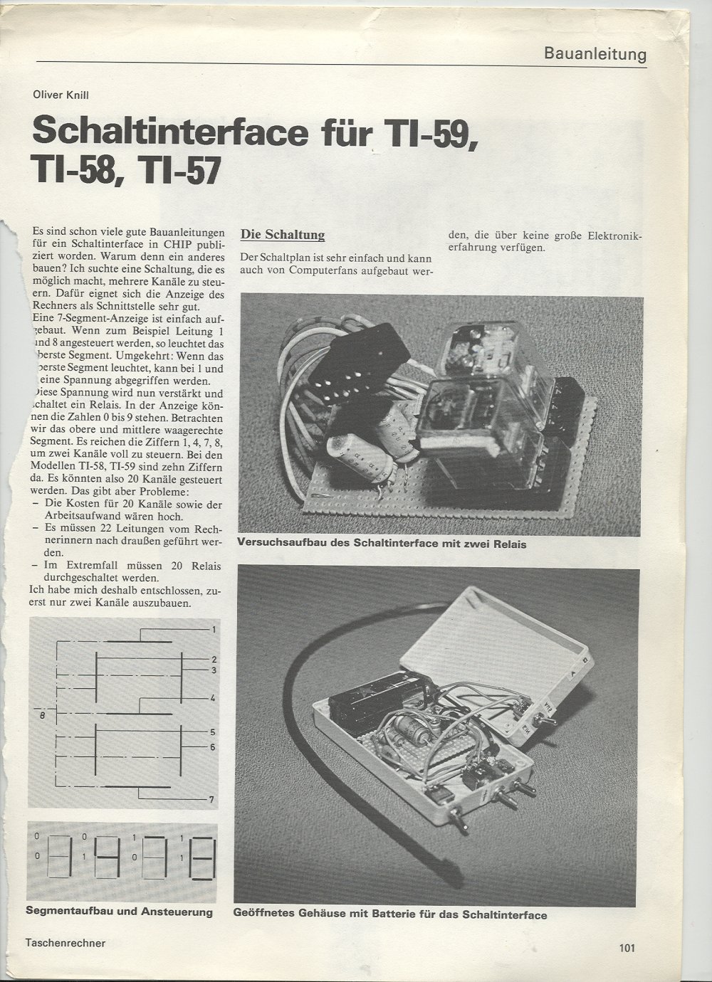 | In 1982, I built two interfaces for the TI 59 calculator. One was an "external flag" which could be used as an external joy stick, an other was a interface to control appliances. I wrote this up for a special edition of "Chip". Both things worked and the calculator survived all the surgery. |